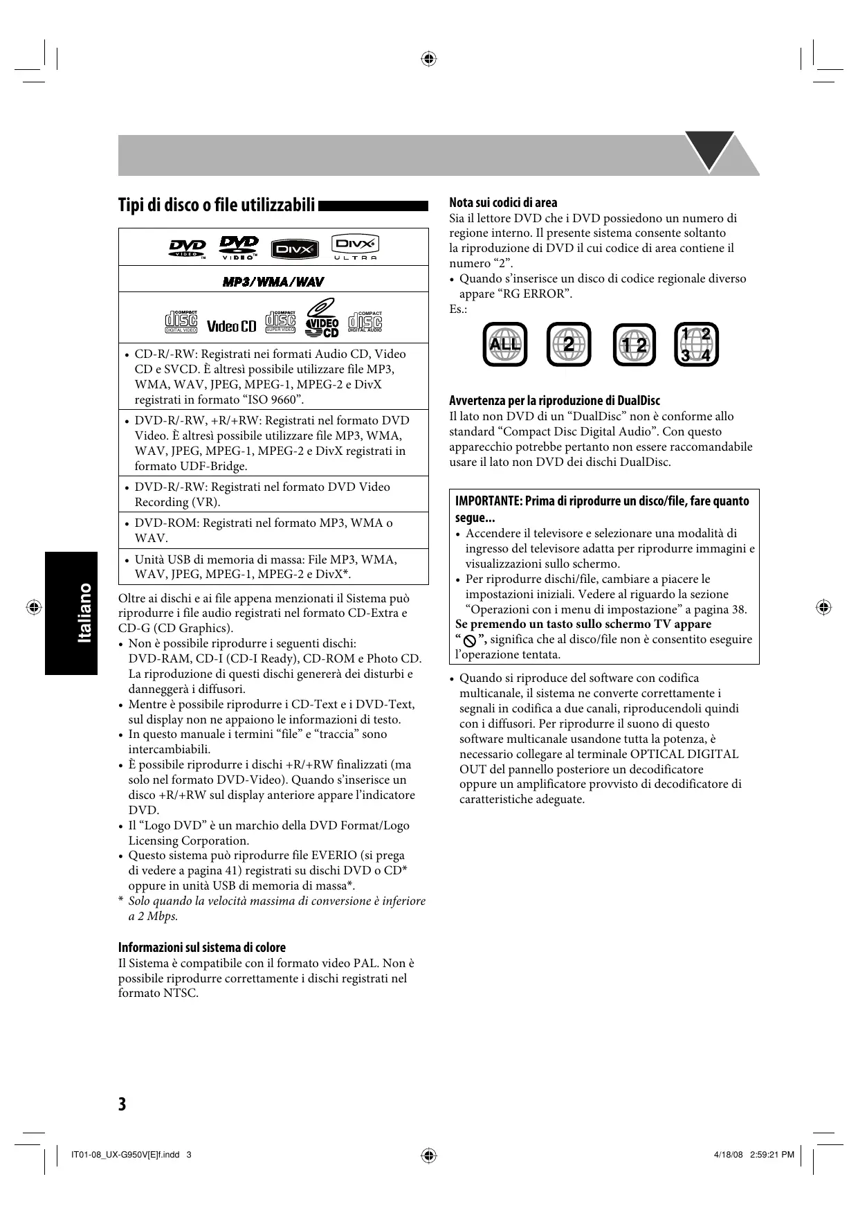 - Unità USB di memoria di massa: File MP3, WMA, WAV, JPEG, MPEG-1, MPEG-2 e DivX*. Italiano Sia il lettore DVD che i DVD possiedono un numero di regione interno. Il presente sistema consente soltanto la riproduzione di DVD il cui codice di area contiene il numero “2”.