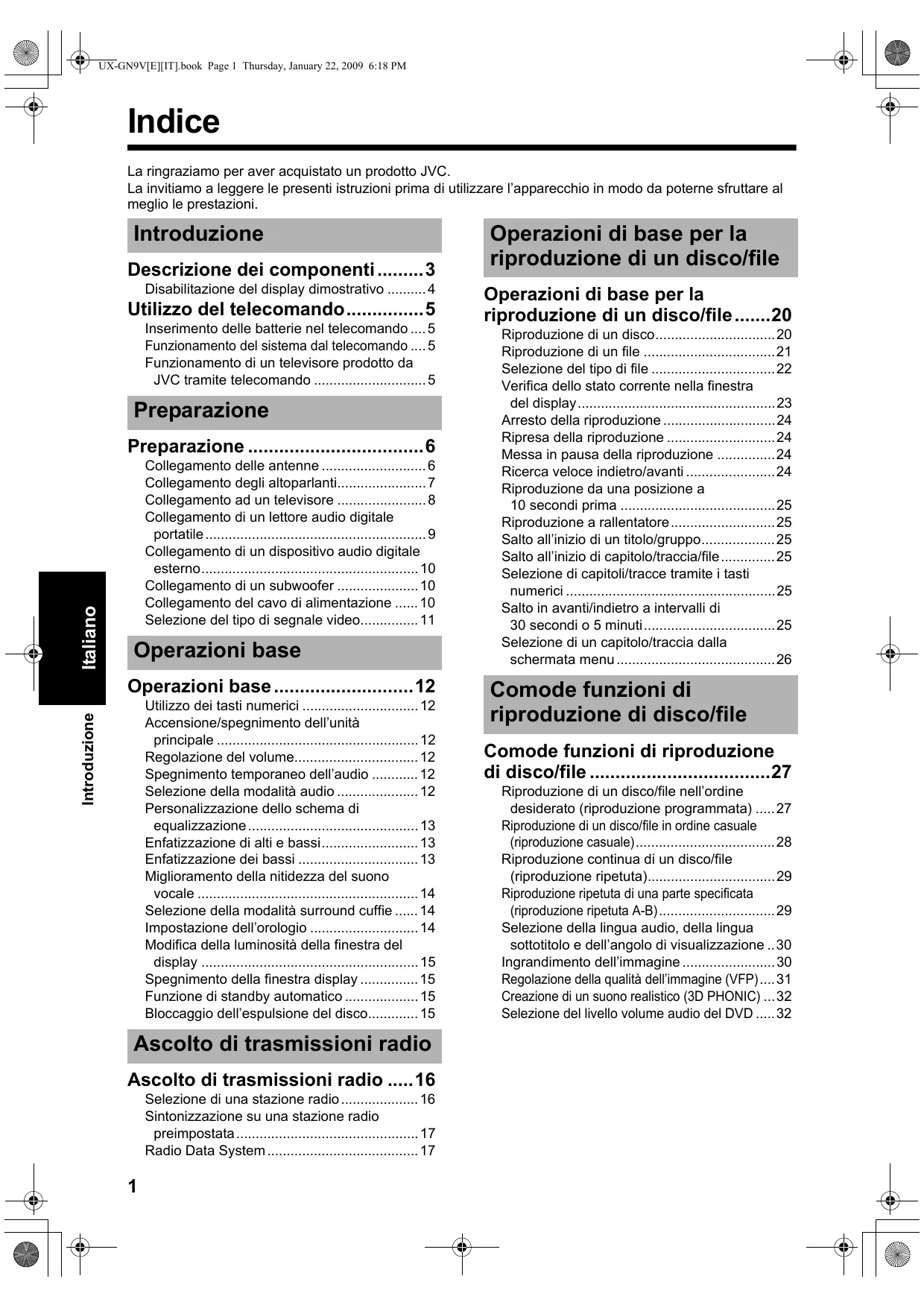 UX-GN9V[E][IT].book Page 1 Thursday, January 22, 2009 6:18 PM Indice La ringraziamo per aver acquistato un prodotto JVC. La invitiamo a leggere le presenti istruzioni prima di utilizzare l’apparecchio in modo da poterne sfruttare al meglio le prestazioni.