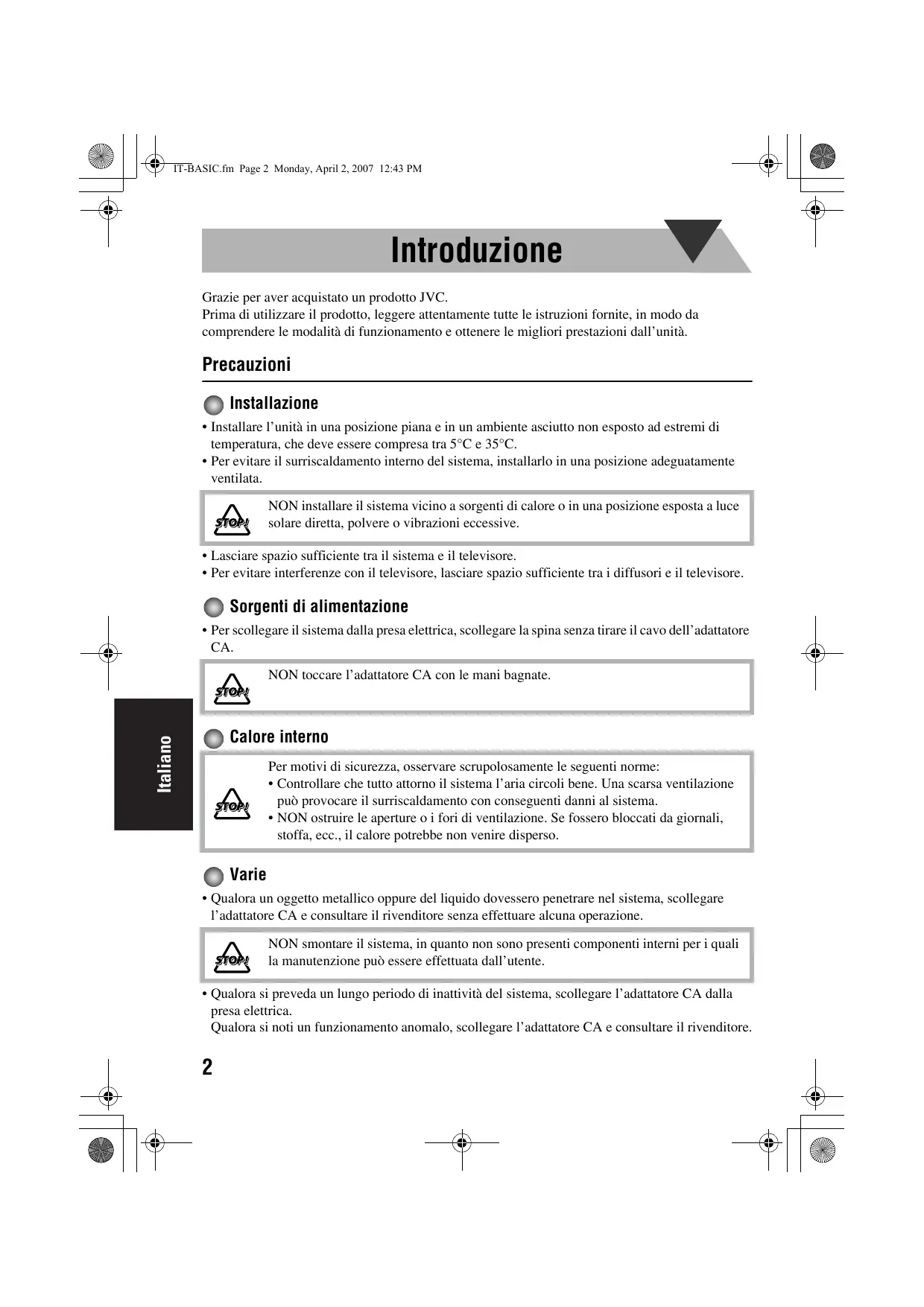 IT-BASIC.fm Page 2 Monday, April 2, 2007 12:43 PM Introduzione Grazie per aver acquistato un prodotto JVC. Prima di utilizzare il prodotto, leggere attentamente tutte le istruzioni fornite, in modo da comprendere le modalità di funzionamento e ottenere le migliori prestazioni dall’unità. Precauzioni Installazione