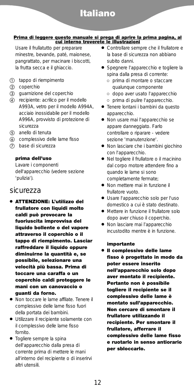 Controllare sempre che il frullatore e la base di sicurezza non abbiano subito danni. Spegnere l'apparecchio e togliere la spina dalla presa di corrente: ● prima di montare o staccare qualunque componente ● dopo aver usato l'apparecchio ● prima di pulire l'apparecchio. Tenere lontani i bambini da questo apparecchio. Non usare mai l'apparecchio se appare danneggiato. Farlo controllare o riparare - vedere sezione 'manutenzione'. Non lasciare che i bambini giochino con l'apparecchio. Nel togliere il frullatore o il macinino dal corpo motore attendere fino a quando le lame si sono completamente fermate; Non mettere mai in funzione il frullatore vuoto. Usare l'apparecchio solo per l'uso domestico a cui è stato destinato. Mettere in funzione il frullatore solo dopo aver chiuso il coperchio. Non lasciare mai l’apparecchio incustodito mentre è in funzione. importante Il complessivo delle lame fisso è progettato in modo da poter essere inserito nell’apparecchio solo dopo aver montato il recipiente. Pertanto non è possibile togliere il recipiente se il complessivo delle lame è montato sull’apparecchio. Non cercare di smontare il frullatore utilizzando il recipiente. Per smontare il frullatore, afferrare il complessivo delle lame fisso e ruotarlo in senso antiorario per sbloccarlo.