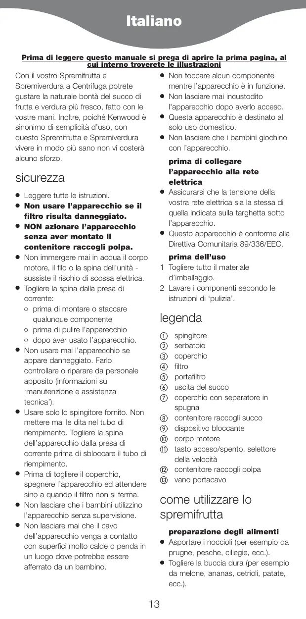 Leggere tutte le istruzioni. Non usare l’apparecchio se il filtro risulta danneggiato. NON azionare l’apparecchio senza aver montato il contenitore raccogli polpa. Non immergere mai in acqua il corpo motore, il filo o la spina dell’unità sussiste il rischio di scossa elettrica. Togliere la spina dalla presa di corrente: ● prima di montare o staccare qualunque componente ● prima di pulire l’apparecchio ● dopo aver usato l’apparecchio. Non usare mai l’apparecchio se appare danneggiato. Farlo controllare o riparare da personale apposito (informazioni su ‘manutenzione e assistenza tecnica’). Usare solo lo spingitore fornito. Non mettere mai le dita nel tubo di riempimento. Togliere la spina dell’apparecchio dalla presa di corrente prima di sbloccare il tubo di riempimento. Prima di togliere il coperchio, spegnere l’apparecchio ed attendere sino a quando il filtro non si ferma. Non lasciare che i bambini utilizzino l’apparecchio senza supervisione. Non lasciare mai che il cavo dell’apparecchio venga a contatto con superfici molto calde o penda in un luogo dove potrebbe essere afferrato da un bambino.