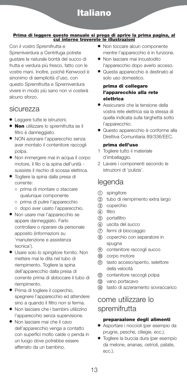 Leggere tutte le istruzioni. Non utilizzare lo spremifrutta se il filtro è danneggiato. NON azionare l’apparecchio senza aver montato il contenitore raccogli polpa. Non immergere mai in acqua il corpo motore, il filo o la spina dell’unità sussiste il rischio di scossa elettrica. Togliere la spina dalla presa di corrente: ● prima di montare o staccare qualunque componente ● prima di pulire l’apparecchio ● dopo aver usato l’apparecchio. Non usare mai l’apparecchio se appare danneggiato. Farlo controllare o riparare da personale apposito (informazioni su ‘manutenzione e assistenza tecnica’). Usare solo lo spingitore fornito. Non mettere mai le dita nel tubo di riempimento. Togliere la spina dell’apparecchio dalla presa di corrente prima di sbloccare il tubo di riempimento. Prima di togliere il coperchio, spegnere l’apparecchio ed attendere sino a quando il filtro non si ferma. Non lasciare che i bambini utilizzino l’apparecchio senza supervisione. Non lasciare mai che il cavo dell’apparecchio venga a contatto con superfici molto calde o penda in un luogo dove potrebbe essere afferrato da un bambino.