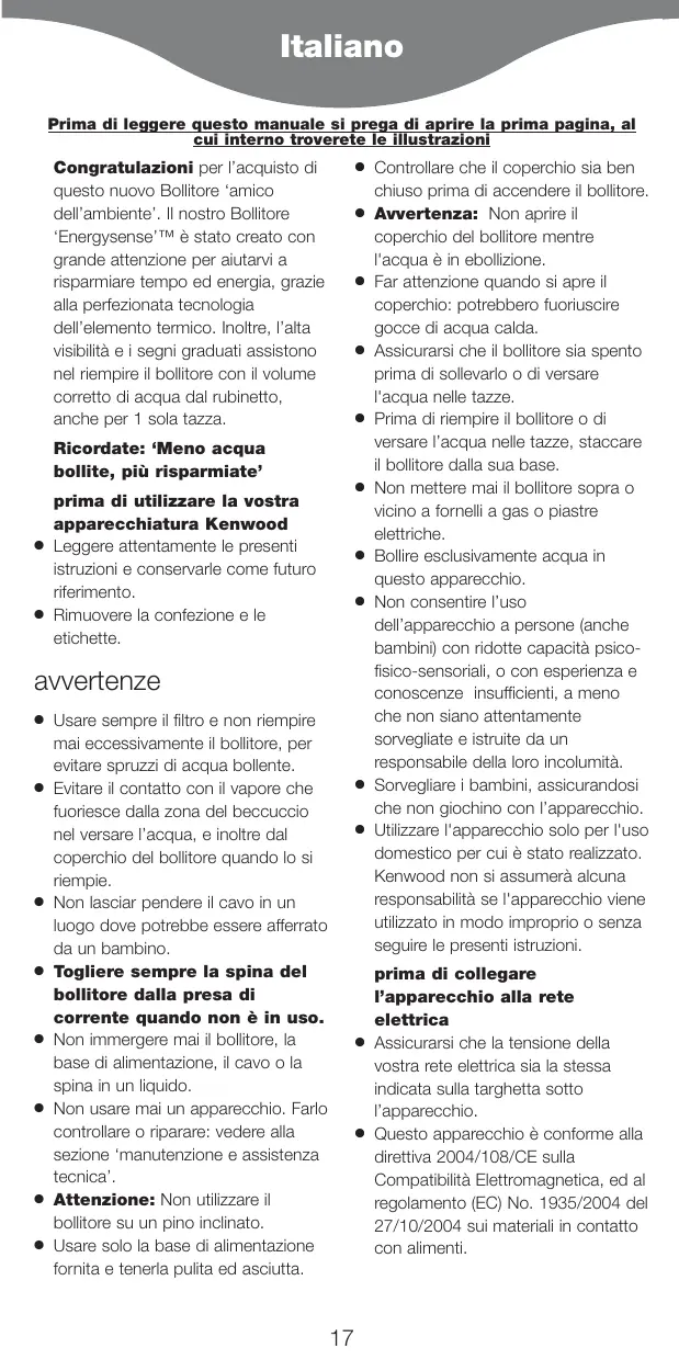Congratulazioni per l’acquisto di questo nuovo Bollitore ‘amico dell’ambiente’. Il nostro Bollitore ‘Energysense’™ è stato creato con grande attenzione per aiutarvi a risparmiare tempo ed energia, grazie alla perfezionata tecnologia dell’elemento termico. Inoltre, l’alta visibilità e i segni graduati assistono nel riempire il bollitore con il volume corretto di acqua dal rubinetto, anche per 1 sola tazza.