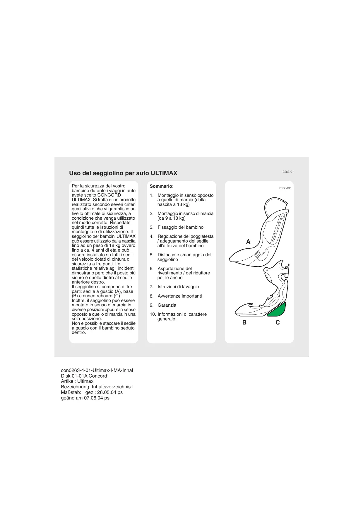 con0262-4-03-Umax-I-MA-Titel1 Disk 01-01A Concord Artikel: Ultimax Bezeichnung: MA-Titelseite-I Maßstab: gez.: 25.05.04 ps geänd am 07.06.04 ps / 14.03.06 ps / 05.04.06 ps 0263-01 Uso del seggiolino per auto ULTIMAX Per la sicurezza del vostro bambino durante i viaggi in auto avete scelto CONCORD ULTIMAX. Si tratta di un prodotto realizzato secondo severi criteri qualitativi e che vi garantisce un livello ottimale di sicurezza, a condizione che venga utilizzato nel modo corretto. Rispettate quindi tutte le istruzioni di montaggio e di utilizzazione. Il seggiolino per bambini ULTIMAX può essere utilizzato dalla nascita fino ad un peso di 18 kg ovvero fino a ca. 4 anni di età e può essere installato su tutti i sedili del veicolo dotati di cintura di sicurezza a tre punti. Le statistiche relative agli incidenti dimostrano però che il posto più sicuro è quello dietro al sedile anteriore destro. Il seggiolino si compone di tre parti: sedile a guscio (A), base (B) e cuneo reboard (C). Inoltre, il seggiolino può essere montato in senso di marcia in diverse posizioni oppure in senso opposto a quello di marcia in una sola posizione. Non è possibile staccare il sedile a guscio con il bambino seduto dentro. con0263-4-01-Ultimax-I-MA-Inhal Disk 01-01A Concord Artikel: Ultimax Bezeichnung: Inhaltsverzeichnis-I Maßstab: gez.: 26.05.04 ps geänd am 07.06.04 ps Sommario: 0106-02