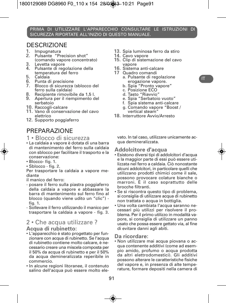 - Sblocco - fig. 2. Per trasportare la caldaia a vapore mediante il manico del ferro: - posare il ferro sulla piastra poggiaferro della caldaia a vapore e abbassare la barra di mantenimento sul ferro fino al blocco (quando viene udito un “clic”) fig. 1. - Sollevare il ferro utilizzando il manico per trasportare la caldaia a vapore - fig. 3. 2 • Che acqua utilizzare ? Acqua di rubinetto:
