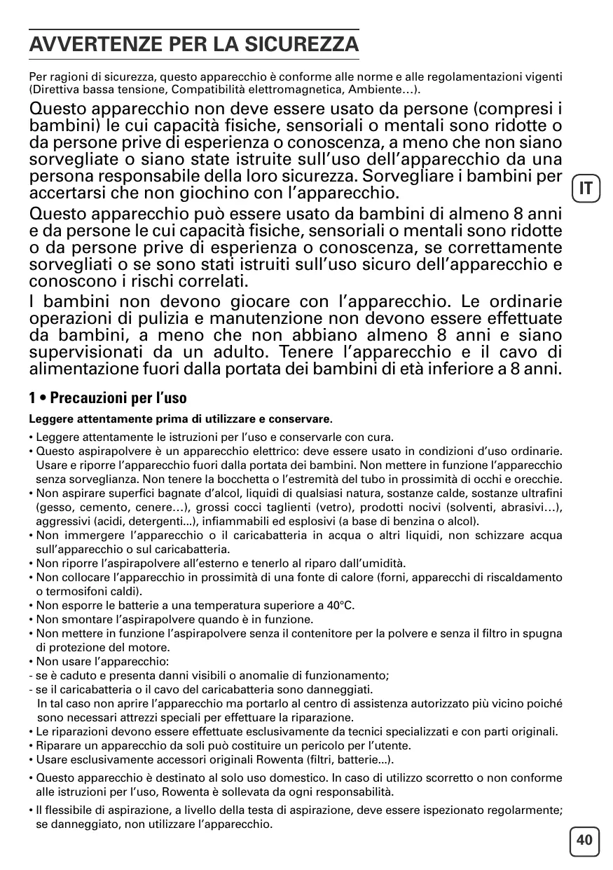 - Questo apparecchio è destinato al solo uso domestico. In caso di utilizzo scorretto o non conforme alle istruzioni per l’uso, Rowenta è sollevata da ogni responsabilità.