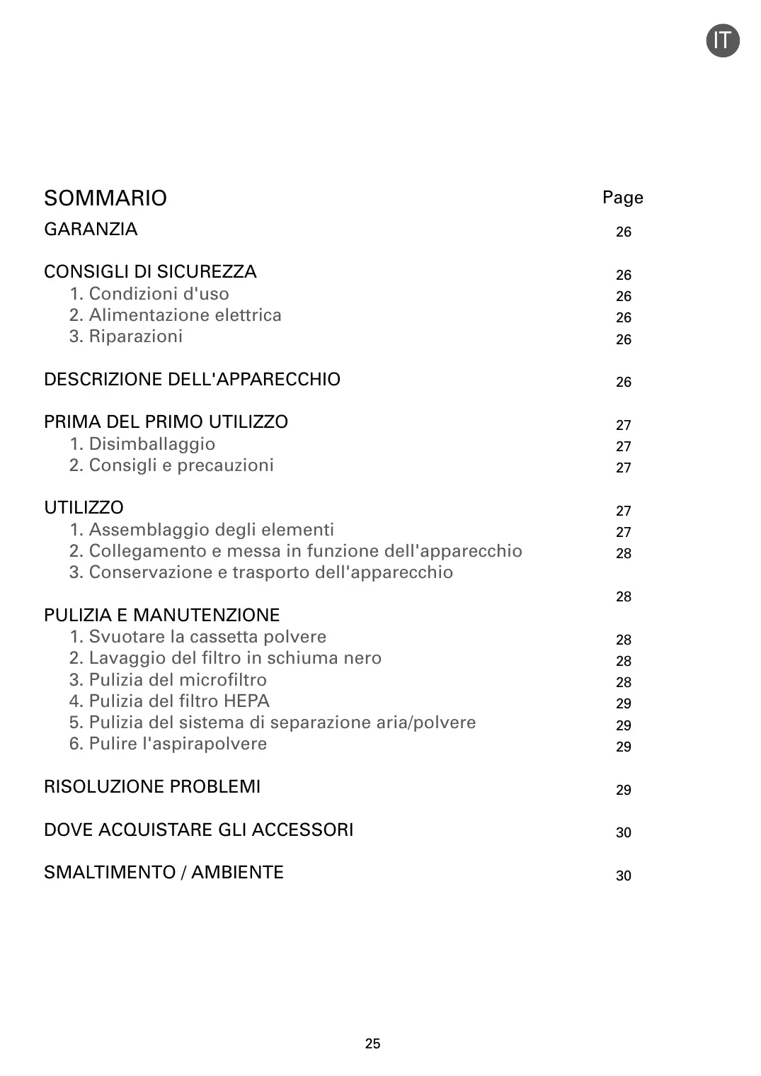 2 • Lavare il filtro in schiuma nero (18a) L'aria che respiriamo contiene particelle che possono causare allergie e problemi: larve e deiezioni di acari, muffe, pollini, fumi e residui animali (peli, pelle, saliva, urina). Le particelle più sottili penetrano profondamente nell'apparato respiratorio, rischiando di provocare infiammazioni e alterare le funzioni respiratorie. I filtri (H)EPA, (High) Efficiency Particulate Air Filter (filtri ad alta efficacia per le particelle aeree) permettono di trattenere anche le particelle più fini. Grazie al filtro (H)EPA, l'aria emessa dall'apparecchio è più salubre di quella aspirata. IMPORTANTE Ogni 6 mesi, o quando le prestazioni dell'aspirapolvere calano, lavare il filtro in schiuma nero. Premere il pulsante di apertura del coperchio (fig. 21). Spostare il coperchio all'indietro (fig. 22). Togliere il filtro in schiuma nero (fig. 23), lavarlo e asciugarlo (fig. 24). Lasciarlo asciugare almeno 12 ore prima di rimetterlo nell'apparecchio. ATTENZIONE Lasciare asciugare completamente il filtro in schiuma nero e controllare che sia perfettamente asciutto. IMPORTANTE Spegnere e scollegare sempre l'aspirapolvere prima di qualsiasi operazione di pulizia o manutenzione. Controllare e pulire sempre l'aspirapolvere e i filtri. Sostituire il filtro in schiuma nero e chiudere il coperchio. 3 • Pulire il microfiltro (18b) ATTENZIONE Non azionare mai l'aspirapolvere senza sistema di filtraggio (schiuma, microfiltro e filtro). IMPORTANTE Ogni 6 mesi, lavare il microfiltro. Premere il pulsante di apertura del coperchio (fig. 21). Spostare il coperchio all'indietro (fig. 22). Togliere la cassetta filtro (18), poi separare il filtro in schiuma nero (18a) del microfiltro (18b) (fig. 25). Lavare il microfiltro (fig. 26). Lasciarlo asciugare almeno 12 ore prima di rimetterlo nell'apparecchio. 1 • Svuotare la cassetta polvere (5) Dopo ogni utilizzo svuotare la cassetta polvere come illustrato di seguito: Prendere la cassetta tirandola per l'impugnatura (fig. 15). Separare la cassetta polveri fini (5b) dalla cassetta principale (5a) (fig. 16). Svuotare la cassetta principale in un cestino dei rifiuti (fig. 17), poi svuotare la cassetta polveri fini (5b) (fig. 18). Pulire i giunti della cassetta aiutandosi con un panno. Rimettere in posizione la cassetta polveri fini nella cassetta principale (fig. 19), poi riporre il tutto nella sua sede (fig. 20). ATTENZIONE Lasciare asciugare completamente il microfiltro e controllare che sia ben asciutto prima di rimetterlo nella sua sede. Sostituire il filtro in schiuma nero e chiudere il coperchio. ATTENZIONE Non superare mai il livello massimo (6) indicato sulla cassetta polvere.