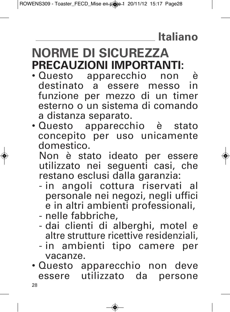 Questo appearecchio è stato concepito per uso unicamente domestico. Non è stato ideato per essere utilizzato nei seguenti casi, che restano escludi dalla garanzia: