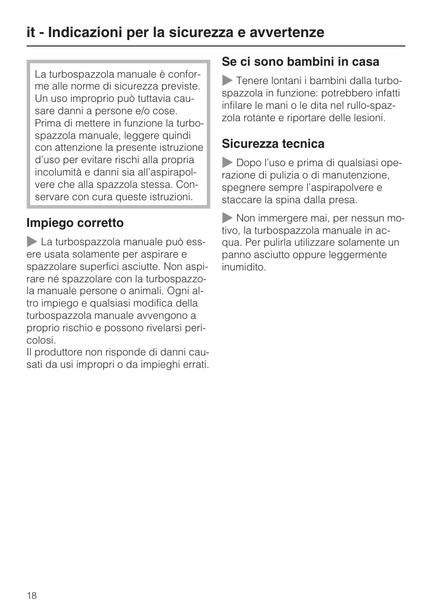 it - Indicazioni per la sicurezza e avvertenze Se ci sono bambini in casa La turbospazzola manuale è conforme alle norme di sicurezza previste. Un uso improprio può tuttavia causare danni a persone e/o cose. Prima di mettere in funzione la turbospazzola manuale, leggere quindi con attenzione la presente istruzione d’uso per evitare rischi alla propria incolumità e danni sia all’aspirapolvere che alla spazzola stessa. Conservare con cura queste istruzioni.