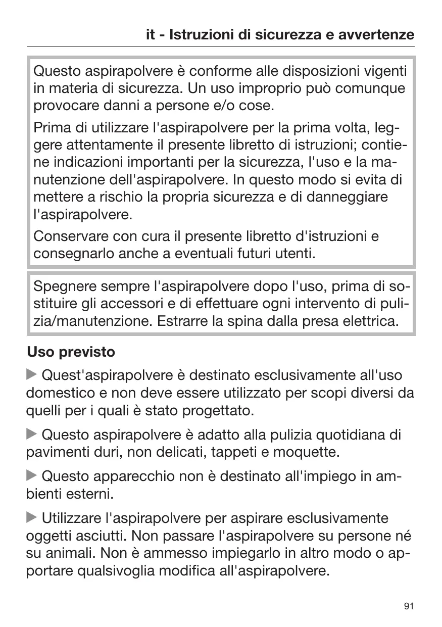 it - Istruzioni di sicurezza e avvertenze Questo aspirapolvere è conforme alle disposizioni vigenti in materia di sicurezza. Un uso improprio può comunque provocare danni a persone e/o cose. Prima di utilizzare l'aspirapolvere per la prima volta, leggere attentamente il presente libretto di istruzioni; contiene indicazioni importanti per la sicurezza, l'uso e la manutenzione dell'aspirapolvere. In questo modo si evita di mettere a rischio la propria sicurezza e di danneggiare l'aspirapolvere. Conservare con cura il presente libretto d'istruzioni e consegnarlo anche a eventuali futuri utenti. Spegnere sempre l'aspirapolvere dopo l'uso, prima di sostituire gli accessori e di effettuare ogni intervento di pulizia/manutenzione. Estrarre la spina dalla presa elettrica. Uso previsto Quest'aspirapolvere è destinato esclusivamente all'uso domestico e non deve essere utilizzato per scopi diversi da quelli per i quali è stato progettato. Questo aspirapolvere è adatto alla pulizia quotidiana di pavimenti duri, non delicati, tappeti e moquette. Questo apparecchio non è destinato all'impiego in ambienti esterni. Utilizzare l'aspirapolvere per aspirare esclusivamente oggetti asciutti. Non passare l'aspirapolvere su persone né su animali. Non è ammesso impiegarlo in altro modo o apportare qualsivoglia modifica all'aspirapolvere.