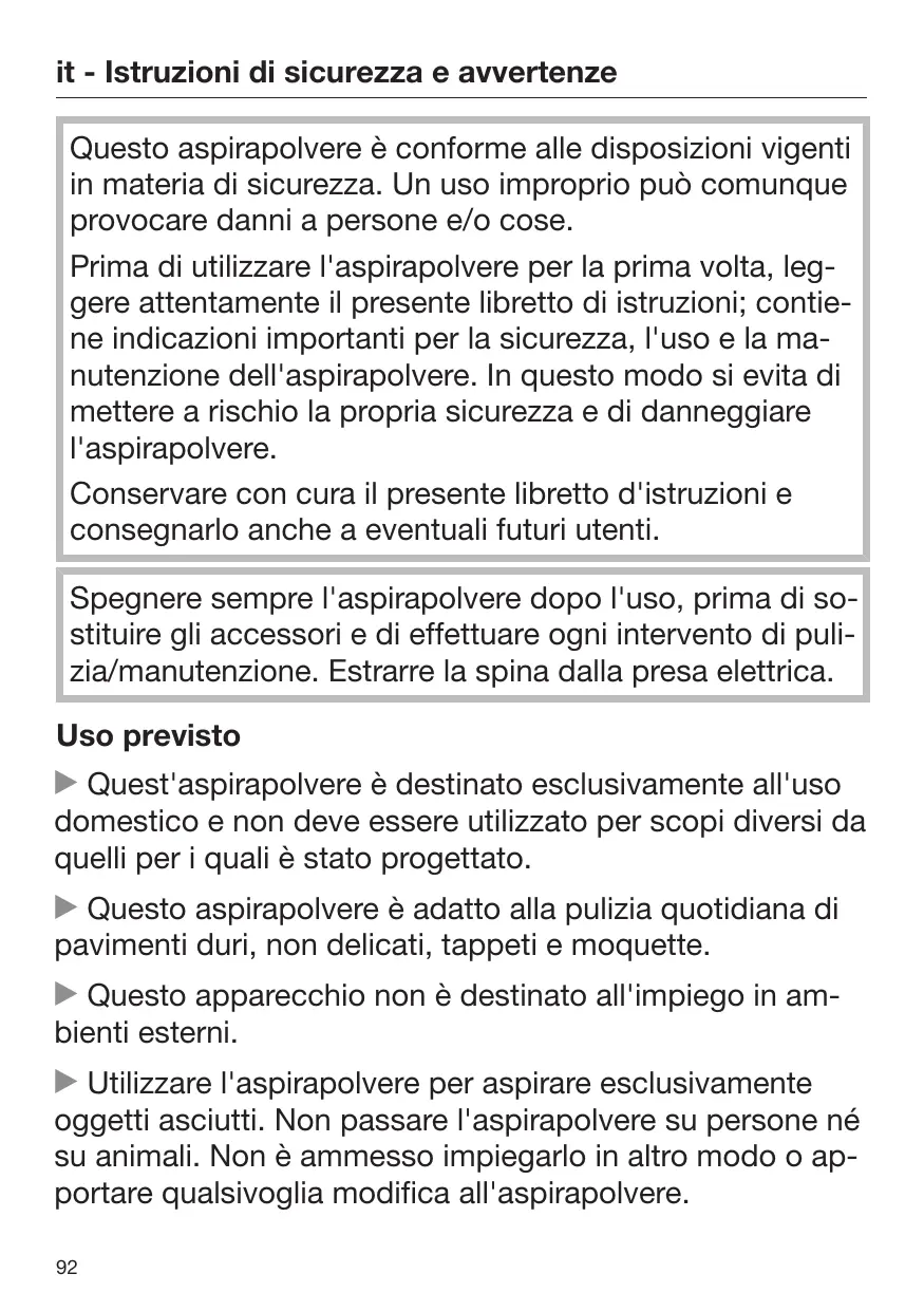 Prima di utilizzare l'aspirapolvere per la prima volta, leggere attendamente il presente libretto di istruzioni; contieneindicazioni importanti per la sicurezza, I'uso e la manutenzione dell'aspirapolvere. In questo modo si evita diMETTERE a rischio la propria sicurezza e di danneggiareI'aspirapolvere.