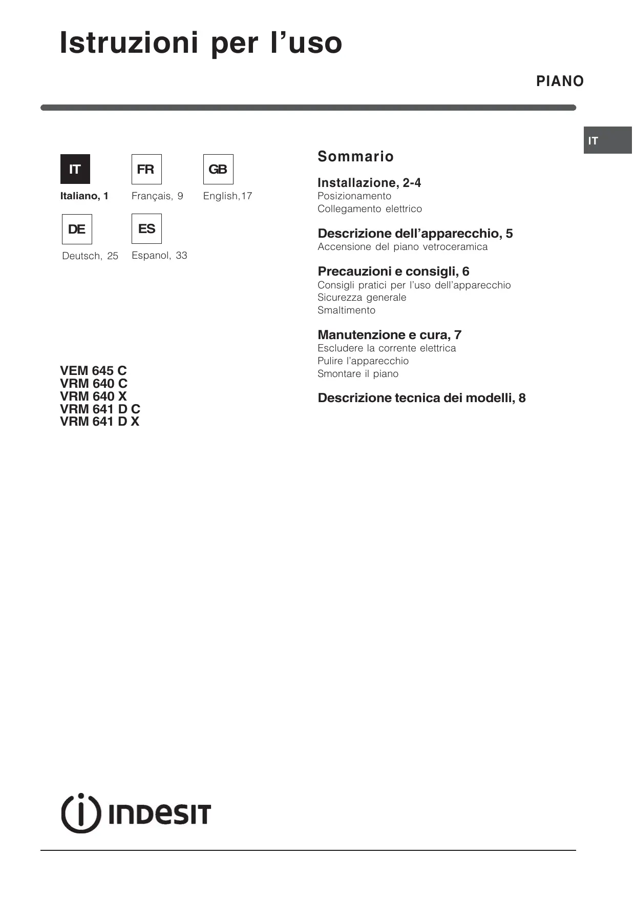 English,17 Sommario Installazione, 2-4 Posizionamento Collegamento elettrico Descrizione dellapparecchio, 5 Accensione del piano vetroceramica Precauzioni e consigli, 6 Consigli pratici per luso dellapparecchio Sicurezza generale Smaltimento Manutenzione e cura, 7 VEM 645 C VRM 640 C VRM 640 X