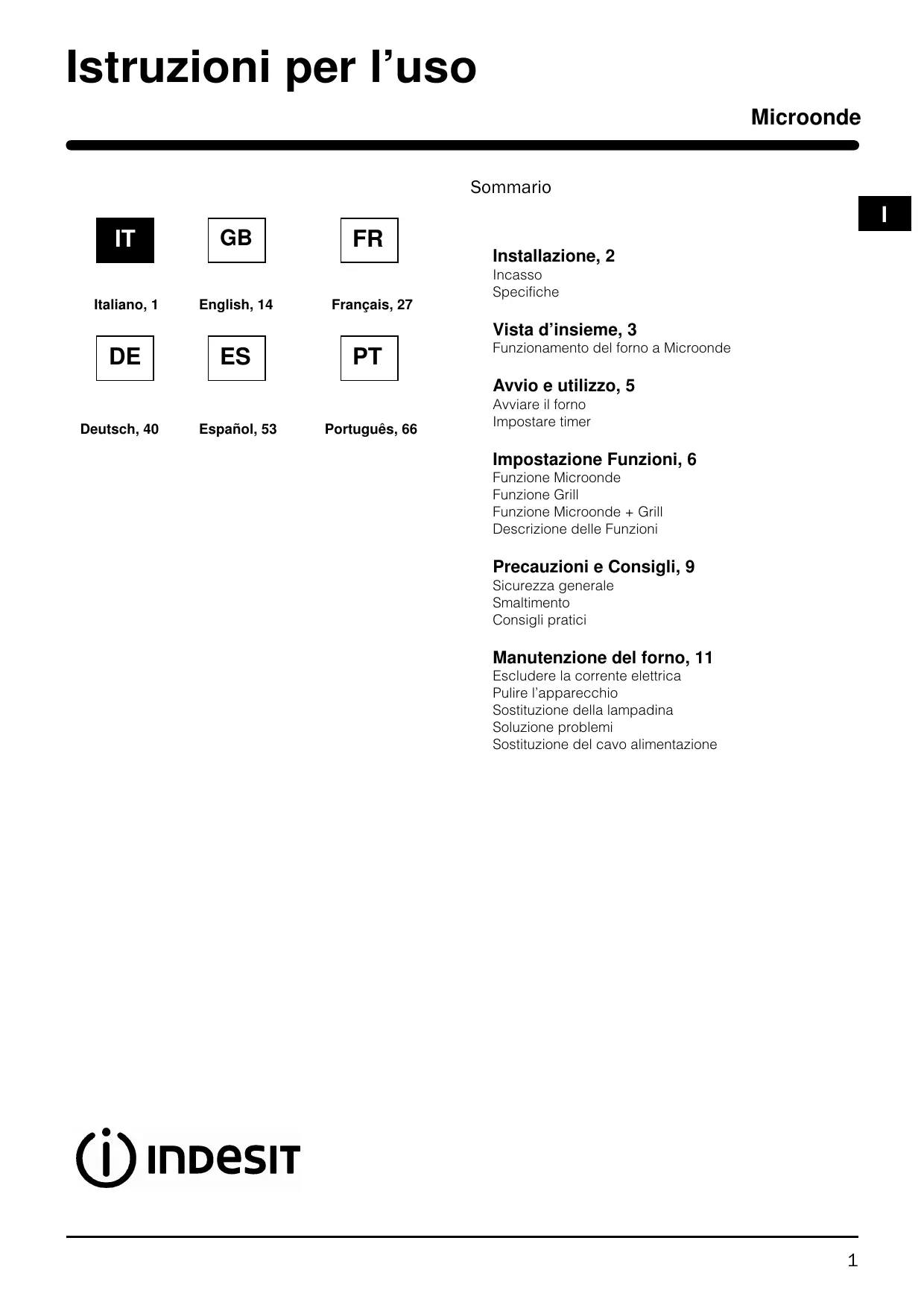 Funzionamento del forno a Microonde Avvio e utilizzo, 5 Deutsch, 40 Español, 53 Português, 66 Avviare il forno Impostare timer Impostazione Funzioni, 6 Funzione Microonde Funzione Grill Funzione Microonde + Grill Descrizione delle Funzioni Precauzioni e Consigli, 9 Sicurezza generale Smaltimento Consigli pratici Manutenzione del forno, 11 Escludere la corrente elettrica Pulire l’apparecchio Sostituzione della lampadina Soluzione problemi Sostituzione del cavo alimentazione