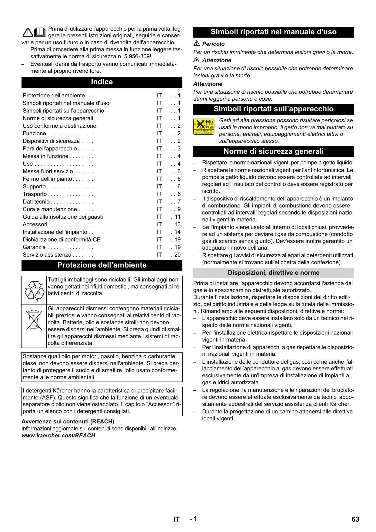 Protezione dell’ambiente Rispettare le norme nazionali vigenti per pompe a getto liquido. Rispettare le norme nazionali vigenti per l'antinfortunistica. Le pompe a getto liquido devono essere controllate ad intervalli regolari ed il risultato del controllo deve essere registrato per iscritto. Il dispositivo di riscaldamento dell’apparecchio è un impianto di combustione. Gli impianti di combustione devono essere controllati ad intervalli regolari secondo le disposizioni nazionali vigenti in materia. Se l'impianto viene usato all'interno di locali chiusi, provvedere ad un sistema per deviare i gas da combustione (condotto gas di scarico senza giunto). Dev'essere inoltre garantito un adeguato rinnovo dell’aria. Rispettare gli avvisi di sicurezza allegati ai detergenti utilizzati (normalmente si trovano sull'etichetta della confezione). Disposizioni, direttive e norme Tutti gli imballaggi sono riciclabili. Gli imballaggi non vanno gettati nei rifiuti domestici, ma consegnati ai relativi centri di raccolta. Gli apparecchi dismessi contengono materiali riciclabili preziosi e vanno consegnati ai relativi centri di raccolta. Batterie, olio e sostanze simili non devono essere dispersi nell’ambiente. Si prega quindi di smaltire gli apparecchi dismessi mediante i sistemi di raccolta differenziata. Sostanze quali olio per motori, gasolio, benzina o carburante diesel non devono essere dispersi nell'ambiente. Si prega pertanto di proteggere il suolo e di smaltire l'olio usato conformemente alle norme ambientali. I detergenti Kärcher hanno la caratteristica di precipitare facilmente (ASF). Questo significa che la funzione di un eventuale separatore d'olio non viene ostacolato. Il capitolo “Accessori” riporta un elenco con i detergenti consigliati. Avvertenze sui contenuti (REACH) Informazioni aggiornate sui contenuti sono disponibili all'indirizzo: www.kaercher.com/REACH