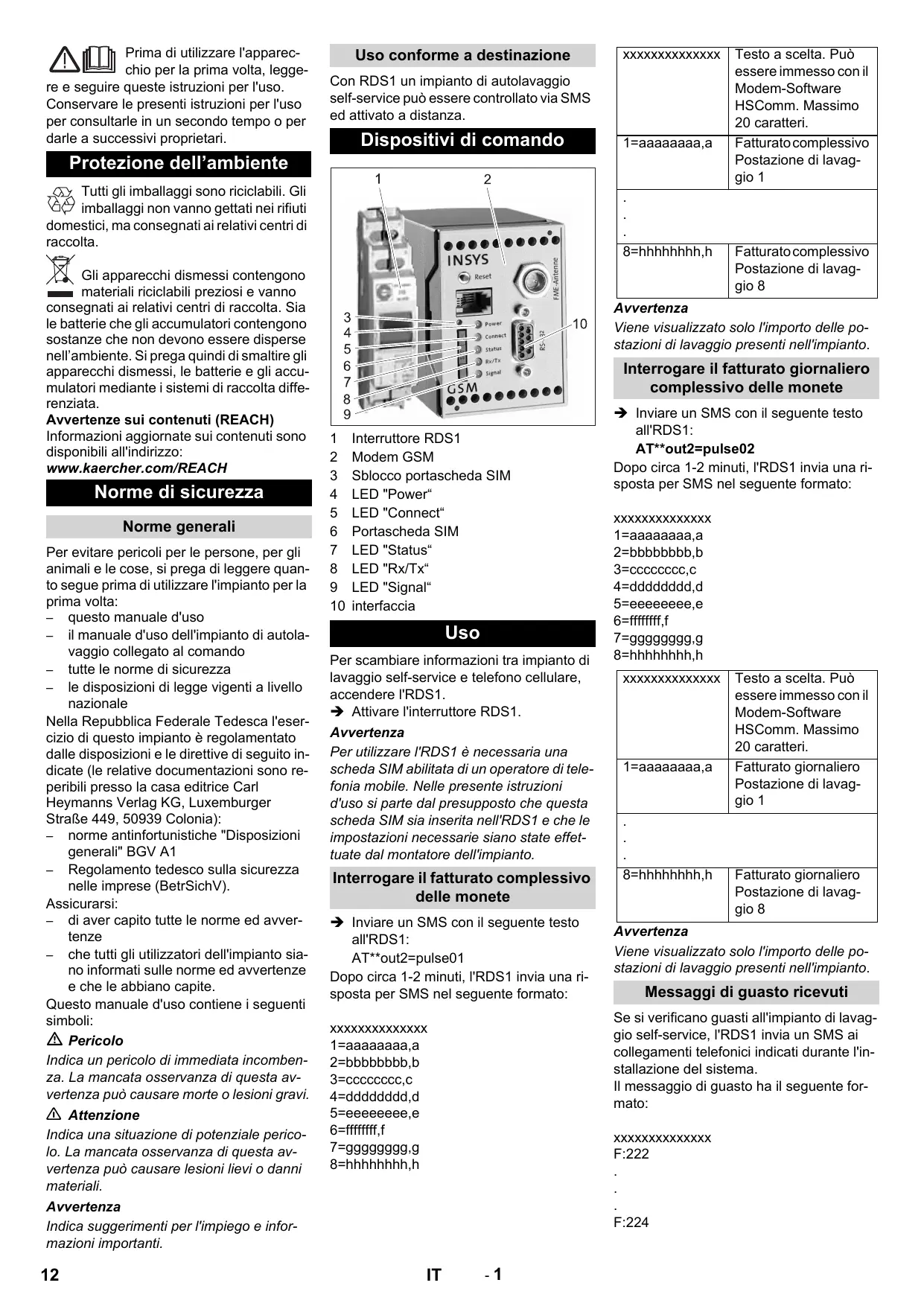 www.kaercher.com/REACH Norme di sicurezza Norme generali Per evitare pericoli per le persone, per gli animali e le cose, si prega di leggere quanto segue prima di utilizzare l'impianto per la prima volta: – questo manuale d'uso – il manuale d'uso dell'impianto di autolavaggio collegato al comando – tutte le norme di sicurezza – le disposizioni di legge vigenti a livello nazionale Nella Repubblica Federale Tedesca l'esercizio di questo impianto è regolamentato dalle disposizioni e le direttive di seguito indicate (le relative documentazioni sono reperibili presso la casa editrice Carl Heymanns Verlag KG, Luxemburger Straße 449, 50939 Colonia): – norme antinfortunistiche "Disposizioni generali" BGV A1 – Regolamento tedesco sulla sicurezza nelle imprese (BetrSichV). Assicurarsi: – di aver capito tutte le norme ed avvertenze – che tutti gli utilizzatori dell'impianto siano informati sulle norme ed avvertenze e che le abbiano capite. Questo manuale d'uso contiene i seguenti simboli: Pericolo Indica un pericolo di immediata incombenza. La mancata osservanza di questa avvertenza può causare morte o lesioni gravi. 몇 Attenzione Indica una situazione di potenziale pericolo. La mancata osservanza di questa avvertenza può causare lesioni lievi o danni materiali. Avvertenza Indica suggerimenti per l'impiego e informazioni importanti.