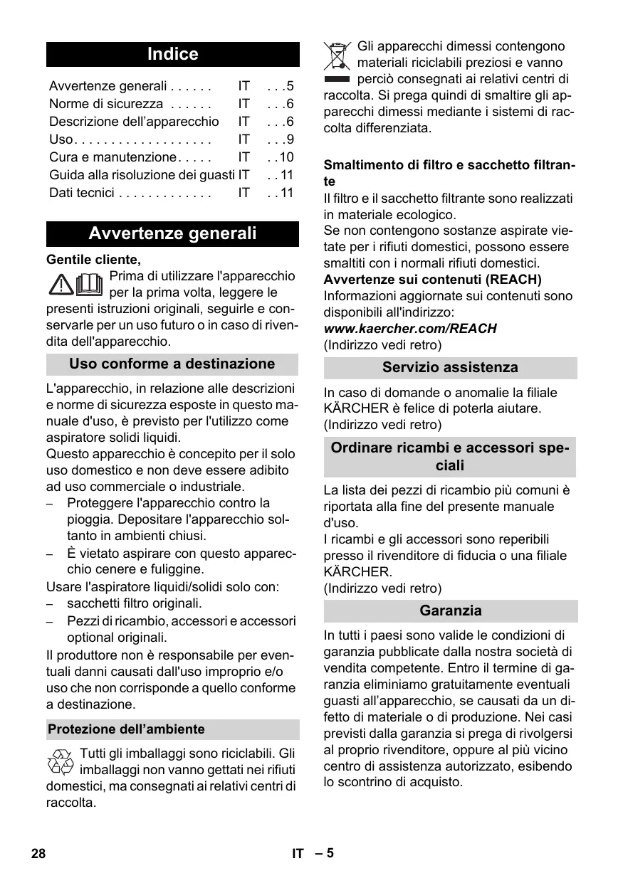 Elimination du filtre et du sac du filtre Le filtre et le sac du filtre sont fabriqués en matériaux recyclables. S'ils ne contiennent aucune substance aspirée dont l'élimination est interdite dans les déchets ménagers, vous pouvez les jeter dans les déchets ordinaires. Instructions relatives aux ingrédients (REACH) Les informations actuelles relatives aux ingrédients se trouvent sous : www.kaercher.com/REACH (Adresse au dos)