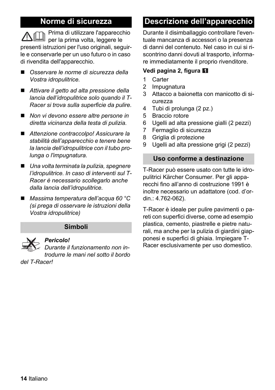 Attention au recul ! Assurer une bonne stabilité et bien tenir le pistolet haute pression avec la rallonge ou la poignée. Mettre le nettoyeur haute pression hors service à la fin du nettoyage. Lors du travail sur le T-Racer, séparer de plus celui-ci du pistolet haute pression. Température d’eau maximale 60 °C (observer les instructions de votre nettoyeur haute pression).