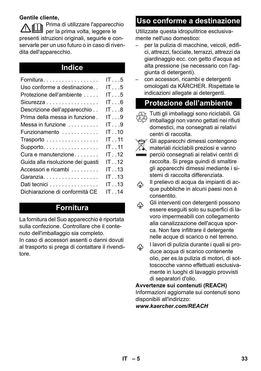 Protezione dell’ambiente Tutti gli imballaggi sono riciclabili. Gli imballaggi non vanno gettati nei rifiuti domestici, ma consegnati ai relativi centri di raccolta. Gli apparecchi dimessi contengono materiali riciclabili preziosi e vanno perciò consegnati ai relativi centri di raccolta. Si prega quindi di smaltire gli apparecchi dimessi mediante i sistemi di raccolta differenziata. Il prelievo di acqua da impianti di acque pubbliche in alcuni paesi non è consentito. Gli interventi con detergenti possono essere eseguiti solo su superfici di lavoro impermeabili con collegamento alla canalizzazione dell'acqua sporca. Non fare infiltrare il detergente nelle acque di scarico o nel terreno. I lavori di pulizia durante i quali si produce acqua di scarico contenente olio, per es.la pulizia di motori, di sottoscocche vanno effettuati esclusivamente in luoghi di lavaggio provvisti di separatori d'olio. Avvertenze sui contenuti (REACH) Informazioni aggiornate sui contenuti sono disponibili all'indirizzo: