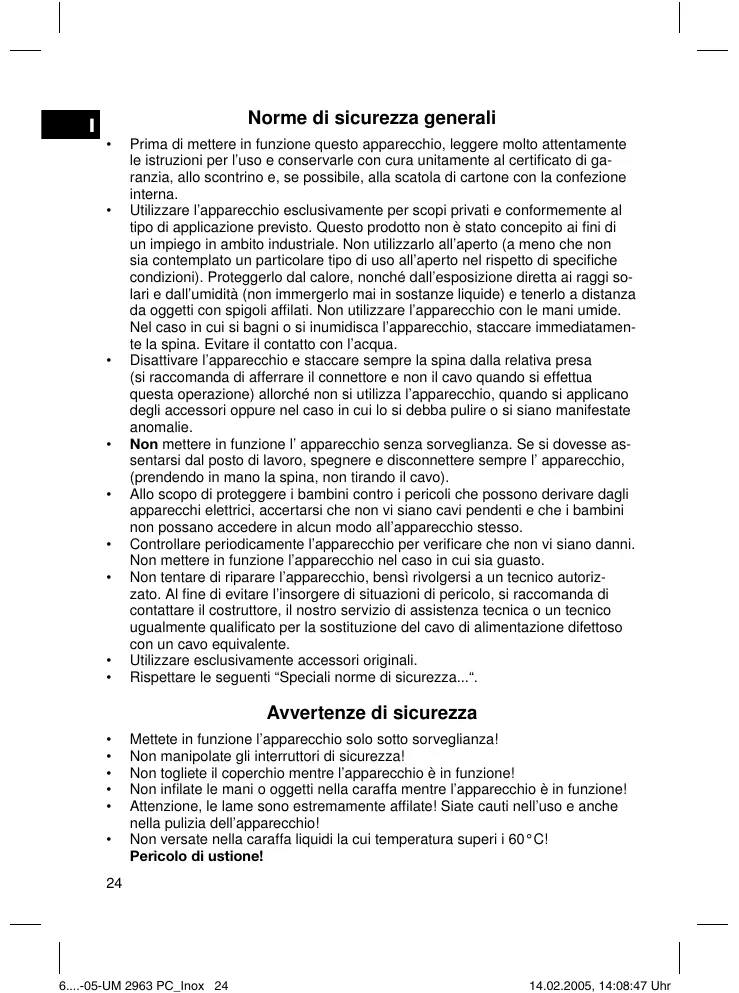Mettete in funzione l’apparecchio solo sotto sorveglianza! Non manipolate gli interruttori di sicurezza! Non togliete il coperchio mentre l’apparecchio è in funzione! Non infilate le mani o oggetti nella caraffa mentre l’apparecchio è in funzione! Attenzione, le lame sono estremamente affilate! Siate cauti nell’uso e anche nella pulizia dell’apparecchio! Non versate nella caraffa liquidi la cui temperatura superi i 60°C! Pericolo di ustione!