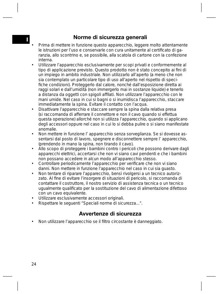 Non mettere in funzione I' apparecchio sino sorveglianza. Se si dovesse assentarsi dalippo di lavoro, spegnere e disconnettere sempre I' apparecchio, (rendendo in mano la spina, non tirando il cavò). - Allo scopo di proteggere i bambini contro i pericoli che possono derivare agli apparentecchi elettrici, accertarsi che non vi siano cavi pendenti e che i bambini non possano accederine in alcun modo all'apprecchio"This.