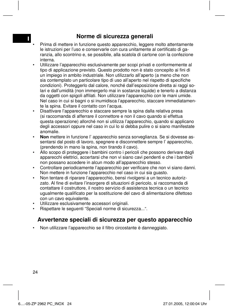 Prima di mettere in funzione questo apparecchio, leggere molto attentamente le istruzioni per l’uso e conservarle con cura unitamente al certificato di garanzia, allo scontrino e, se possibile, alla scatola di cartone con la confezione interna. Utilizzare l’apparecchio esclusivamente per scopi privati e conformemente al tipo di applicazione previsto. Questo prodotto non è stato concepito ai fini di un impiego in ambito industriale. Non utilizzarlo all’aperto (a meno che non sia contemplato un particolare tipo di uso all’aperto nel rispetto di specifiche condizioni). Proteggerlo dal calore, nonché dall’esposizione diretta ai raggi solari e dall’umidità (non immergerlo mai in sostanze liquide) e tenerlo a distanza da oggetti con spigoli affilati. Non utilizzare l’apparecchio con le mani umide. Nel caso in cui si bagni o si inumidisca l’apparecchio, staccare immediatamente la spina. Evitare il contatto con l’acqua. Disattivare l’apparecchio e staccare sempre la spina dalla relativa presa (si raccomanda di afferrare il connettore e non il cavo quando si effettua questa operazione) allorché non si utilizza l’apparecchio, quando si applicano degli accessori oppure nel caso in cui lo si debba pulire o si siano manifestate anomalie. Non mettere in funzione l’ apparecchio senza sorveglianza. Se si dovesse assentarsi dal posto di lavoro, spegnere e disconnettere sempre l’ apparecchio, (prendendo in mano la spina, non tirando il cavo). Allo scopo di proteggere i bambini contro i pericoli che possono derivare dagli apparecchi elettrici, accertarsi che non vi siano cavi pendenti e che i bambini non possano accedere in alcun modo all’apparecchio stesso. Controllare periodicamente l’apparecchio per verificare che non vi siano danni. Non mettere in funzione l’apparecchio nel caso in cui sia guasto. Non tentare di riparare l’apparecchio, bensì rivolgersi a un tecnico autorizzato. Al fine di evitare l’insorgere di situazioni di pericolo, si raccomanda di contattare il costruttore, il nostro servizio di assistenza tecnica o un tecnico ugualmente qualificato per la sostituzione del cavo di alimentazione difettoso con un cavo equivalente. Utilizzare esclusivamente accessori originali. Rispettare le seguenti “Speciali norme di sicurezza...“.