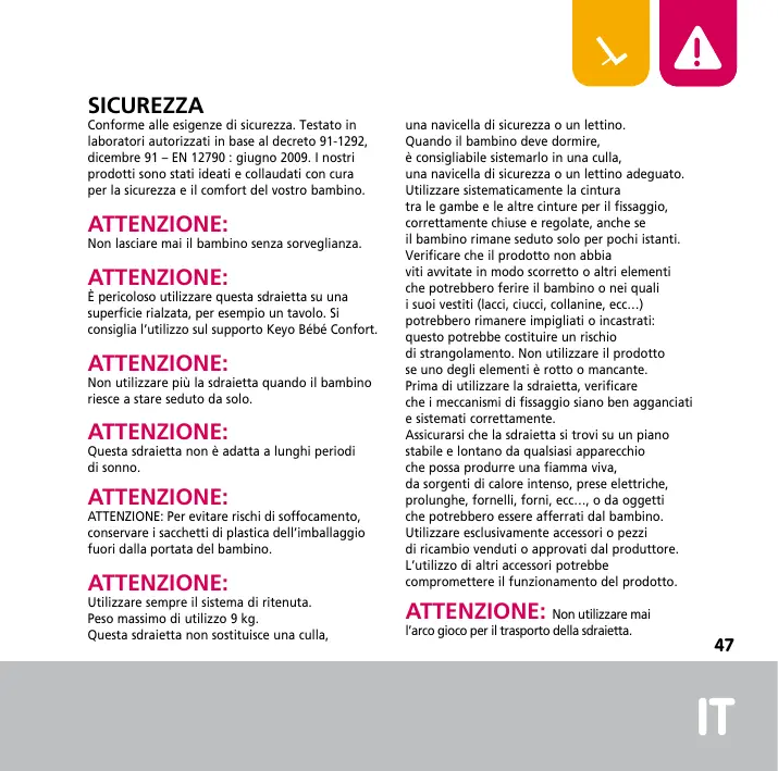 SICUREZZA Conforme alle esigenze di sicurezza. Testato in laboratori autorizzati in base al decreto 91-1292, dicembre 91 – EN 12790 : giugno 2009. I nostri prodotti sono stati ideati e collaudati con cura per la sicurezza e il comfort del vostro bambino. ATTENZIONE: Non lasciare mai il bambino senza sorveglianza. ATTENZIONE: È pericoloso utilizzare questa sdraietta su una superficie rialzata, per esempio un tavolo. Si consiglia l’utilizzo sul supporto Keyo Bébé Confort. ATTENZIONE: Non utilizzare più la sdraietta quando il bambino riesce a stare seduto da solo. ATTENZIONE: Questa sdraietta non è adatta a lunghi periodi di sonno. ATTENZIONE: ATTENZIONE: Per evitare rischi di soffocamento, conservare i sacchetti di plastica dell’imballaggio fuori dalla portata del bambino. ATTENZIONE: Utilizzare sempre il sistema di ritenuta. Peso massimo di utilizzo 9 kg. Questa sdraietta non sostituisce una culla, una navicella di sicurezza o un lettino. Quando il bambino deve dormire, è consigliabile sistemarlo in una culla, una navicella di sicurezza o un lettino adeguato. Utilizzare sistematicamente la cintura tra le gambe e le altre cinture per il fissaggio, correttamente chiuse e regolate, anche se il bambino rimane seduto solo per pochi istanti. Verificare che il prodotto non abbia viti avvitate in modo scorretto o altri elementi che potrebbero ferire il bambino o nei quali i suoi vestiti (lacci, ciucci, collanine, ecc…) potrebbero rimanere impigliati o incastrati: questo potrebbe costituire un rischio di strangolamento. Non utilizzare il prodotto se uno degli elementi è rotto o mancante. Prima di utilizzare la sdraietta, verificare che i meccanismi di fissaggio siano ben agganciati e sistemati correttamente. Assicurarsi che la sdraietta si trovi su un piano stabile e lontano da qualsiasi apparecchio che possa produrre una fiamma viva, da sorgenti di calore intenso, prese elettriche, prolunghe, fornelli, forni, ecc…, o da oggetti che potrebbero essere afferrati dal bambino. Utilizzare esclusivamente accessori o pezzi di ricambio venduti o approvati dal produttore. L’utilizzo di altri accessori potrebbe compromettere il funzionamento del prodotto. ATTENZIONE: Non utilizzare mai l’arco gioco per il trasporto della sdraietta.