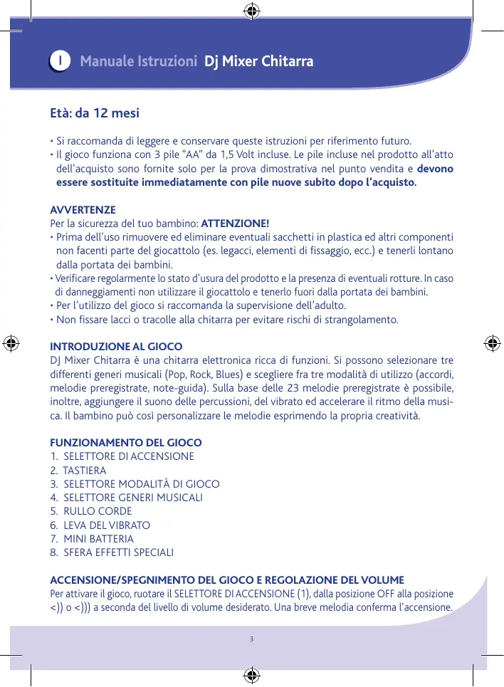 ) si o di na- • Le jouet fonctionne avec 3 piles “AA” de 1,5 Volt incluses. Les piles incluses avec le produit au moment de l’achat ne servent que pour la démonstration sur le point de vente et doivent être remplacées immédiatement par des piles neuves après l’achat. AVERTISSEMENTS Pour la sécurité de votre enfant: ATTENTION! • Avant l’utilisation enlever et éliminer les sachets en plastique et autres éléments éventuels qui ne font pas partie du jouet (par exemple, liens, éléments de fixation, etc.) et les placer hors de portée des enfants. • Vérifier régulièrement l’état d’usure du produit et la présence d’éventuelles détériorations. En cas de dommages, ne pas se servir du jeu et le tenir hors de portée des enfants. • Produit non adapté aux enfants de mois de 36 mois en raison de ses caractéristiques de constructions, de ses fonctions et de la présence de petites pièces. • Pour l’utilisation de ce jouet, nous recommandons la surveillance d’un adulte. • Ne pas attacher de lacets ou de cordons à la guitare pour éviter tout risque d’étranglement. INTRODUCTION AU JEU DJ Mix Guitare est une guitare électronique riche en activités et fonctions. L’enfant peut sélectionner son style musical préféré (Pop, Rock, Blues) et choisir parmi trois modes d’utilisation (accords, mélodies pré-enregistrées, notes-guides). Sur la base des 23 mélodies pré-enregistrées, il peut rajouter le son des percussions, du vibrato et accélérer le rythme de la musique. Tout en développant sa créativité, l’enfant personnalise les mélodies. FONCTIONNEMENT DU JOUET 1. SELECTEUR D’ALLUMAGE 2. CLAVIER 3. SÉLECTEUR MODES DE JEU 4. SÉLECTEUR GENRES MUSICAUX Pour éviter une consommation inutile des piles, nous conseillons de toujours éteindre le jouet après l’utilisation en tournant le SELECTEUR D’ALLUMAGE (1) sur la position OFF.