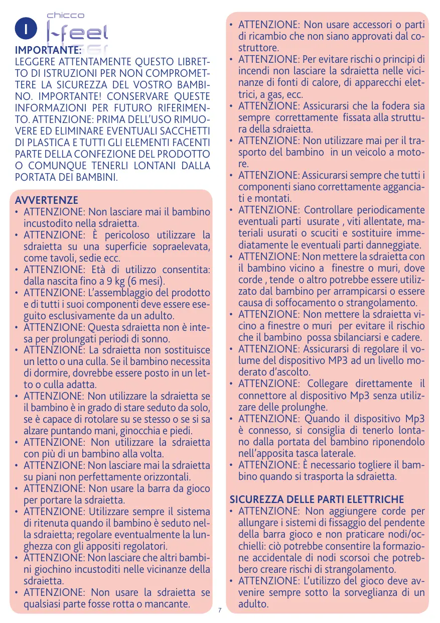 - ATTENZIONE: È necessario togliere il bambino quando si trasporta la sdraietta. IMPORTANTE: LEGGERE ATTENTAMENTE QUESTO LIBRETTO DI ISTRUZIONI PER NON COMPROMETTERE LA SICUREZZA DEL VOSTRO BAMBINO. IMPORTANTE! CONSERVARE QUESTE INFORMAZIONI PER FUTURO RIFERIMENTO. ATTENZIONE: PRIMA DELL’USO RIMUOVERE ED ELIMINARE EVENTUALI SACCHETTI DI PLASTICA E TUTTI GLI ELEMENTI FACENTI