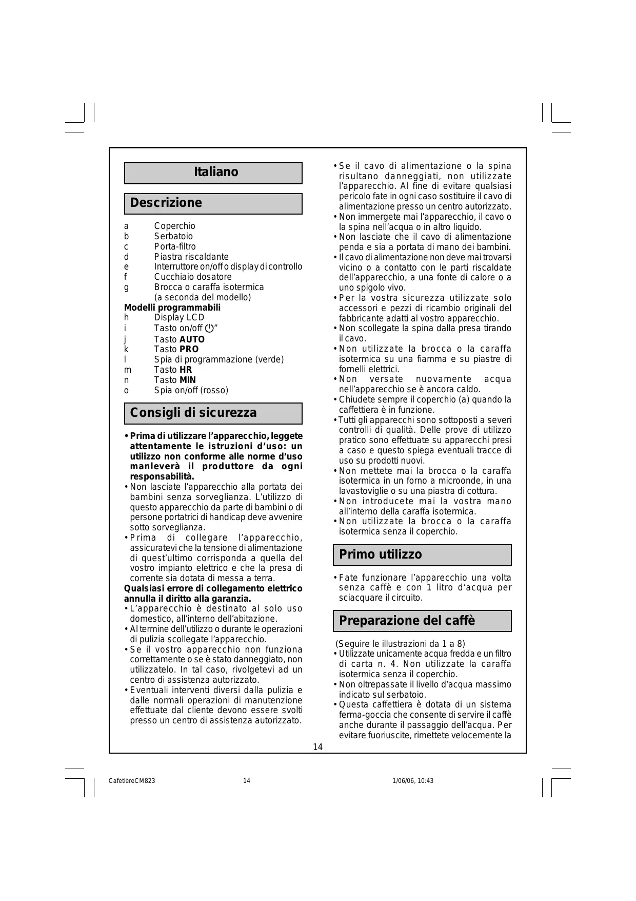 • Verter en la jarra o el vaso isotérmico (g) el equivalente a una taza, y a continuación parar. • Dejar actuar durante una hora. • Volver a poner la cafetera en marcha para que termine de pasar. • Aclarar la cafetera poniéndola a funcionar 2 o 3 veces con 1 litro de agua. La garantía excluye las cafeteras que no funcionan o funcionan mal por no haber realizado las operaciones de desincrustación.