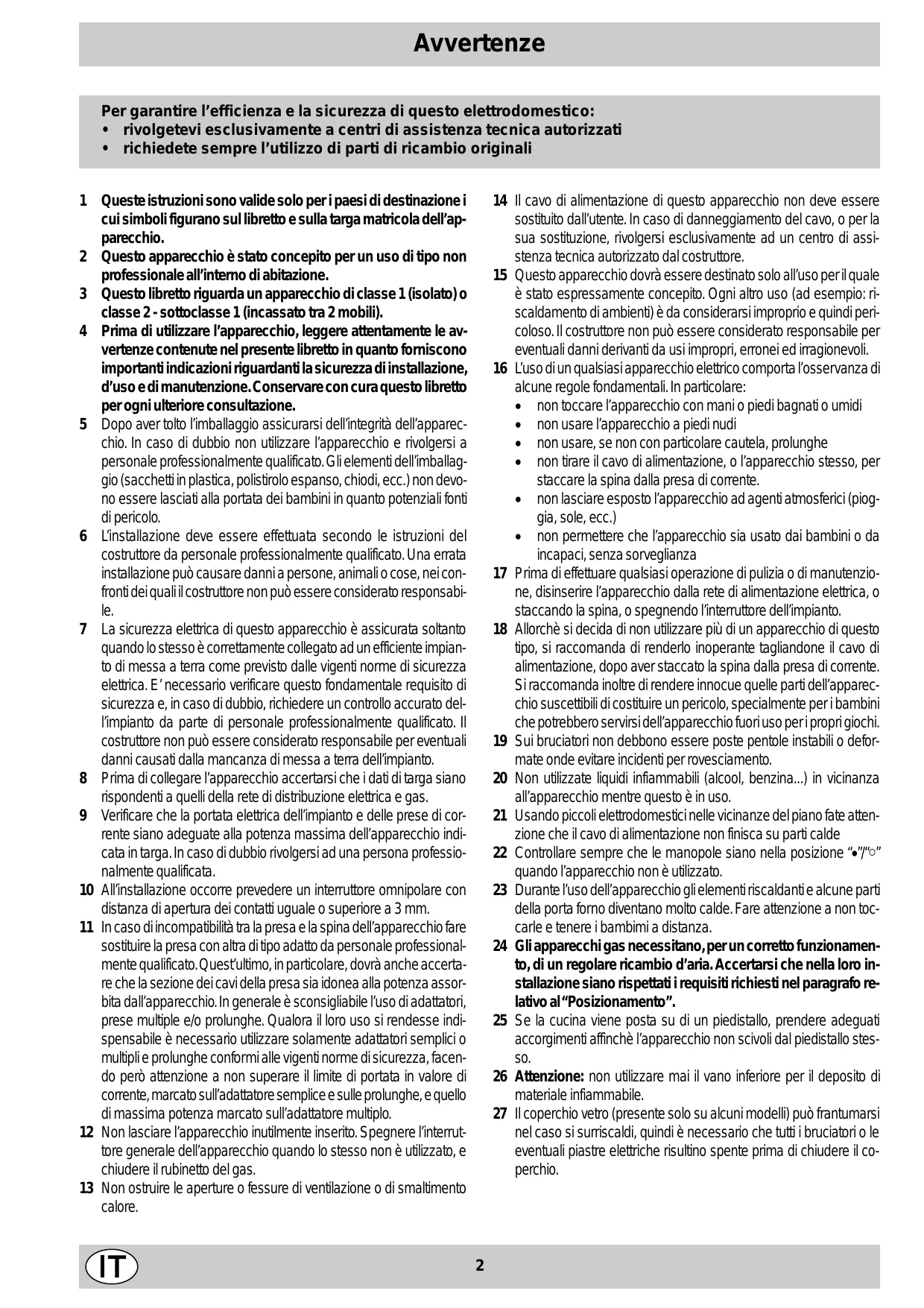 - richiedete sempre l’utilizzo di parti di ricambio originali 1 Queste istruzioni sono valide solo per i paesi di destinazione i cui simboli figurano sul libretto e sulla targa matricola dell’apparecchio. 2 Questo apparecchio è stato concepito per un uso di tipo non professionale all’interno di abitazione. 3 Questo libretto riguarda un apparecchio di classe 1 (isolato) o classe 2 - sottoclasse 1 (incassato tra 2 mobili). 4 Prima di utilizzare l’apparecchio, leggere attentamente le avvertenze contenute nel presente libretto in quanto forniscono importanti indicazioni riguardanti la sicurezza di installazione, d’uso e di manutenzione. Conservare con cura questo libretto per ogni ulteriore consultazione. 5 Dopo aver tolto l’imballaggio assicurarsi dell’integrità dell’apparecchio. In caso di dubbio non utilizzare l’apparecchio e rivolgersi a personale professionalmente qualificato. Gli elementi dell’imballaggio (sacchetti in plastica, polistirolo espanso, chiodi, ecc.) non devono essere lasciati alla portata dei bambini in quanto potenziali fonti di pericolo. 6 L’installazione deve essere effettuata secondo le istruzioni del costruttore da personale professionalmente qualificato. Una errata installazione può causare danni a persone, animali o cose, nei confronti dei quali il costruttore non può essere considerato responsabile. 7 La sicurezza elettrica di questo apparecchio è assicurata soltanto quando lo stesso è correttamente collegato ad un efficiente impianto di messa a terra come previsto dalle vigenti norme di sicurezza elettrica. E’ necessario verificare questo fondamentale requisito di sicurezza e, in caso di dubbio, richiedere un controllo accurato dell’impianto da parte di personale professionalmente qualificato. Il costruttore non può essere considerato responsabile per eventuali danni causati dalla mancanza di messa a terra dell’impianto. 8 Prima di collegare l’apparecchio accertarsi che i dati di targa siano rispondenti a quelli della rete di distribuzione elettrica e gas. 9 Verificare che la portata elettrica dell’impianto e delle prese di corrente siano adeguate alla potenza massima dell’apparecchio indicata in targa. In caso di dubbio rivolgersi ad una persona professionalmente qualificata. 10 All’installazione occorre prevedere un interruttore omnipolare con distanza di apertura dei contatti uguale o superiore a 3 mm. 11 In caso di incompatibilità tra la presa e la spina dell’apparecchio fare sostituire la presa con altra di tipo adatto da personale professionalmente qualificato. Quest’ultimo, in particolare, dovrà anche accertare che la sezione dei cavi della presa sia idonea alla potenza assorbita dall’apparecchio. In generale è sconsigliabile l’uso di adattatori, prese multiple e/o prolunghe. Qualora il loro uso si rendesse indispensabile è necessario utilizzare solamente adattatori semplici o multipli e prolunghe conformi alle vigenti norme di sicurezza, facendo però attenzione a non superare il limite di portata in valore di corrente, marcato sull’adattatore semplice e sulle prolunghe, e quello di massima potenza marcato sull’adattatore multiplo. 12 Non lasciare l’apparecchio inutilmente inserito. Spegnere l’interruttore generale dell’apparecchio quando lo stesso non è utilizzato, e chiudere il rubinetto del gas. 13 Non ostruire le aperture o fessure di ventilazione o di smaltimento calore. 14 Il cavo di alimentazione di questo apparecchio non deve essere sostituito dall’utente. In caso di danneggiamento del cavo, o per la sua sostituzione, rivolgersi esclusivamente ad un centro di assistenza tecnica autorizzato dal costruttore. 15 Questo apparecchio dovrà essere destinato solo all’uso per il quale è stato espressamente concepito. Ogni altro uso (ad esempio: riscaldamento di ambienti) è da considerarsi improprio e quindi pericoloso. Il costruttore non può essere considerato responsabile per eventuali danni derivanti da usi impropri, erronei ed irragionevoli. 16 L’uso di un qualsiasi apparecchio elettrico comporta l’osservanza di alcune regole fondamentali. In particolare: