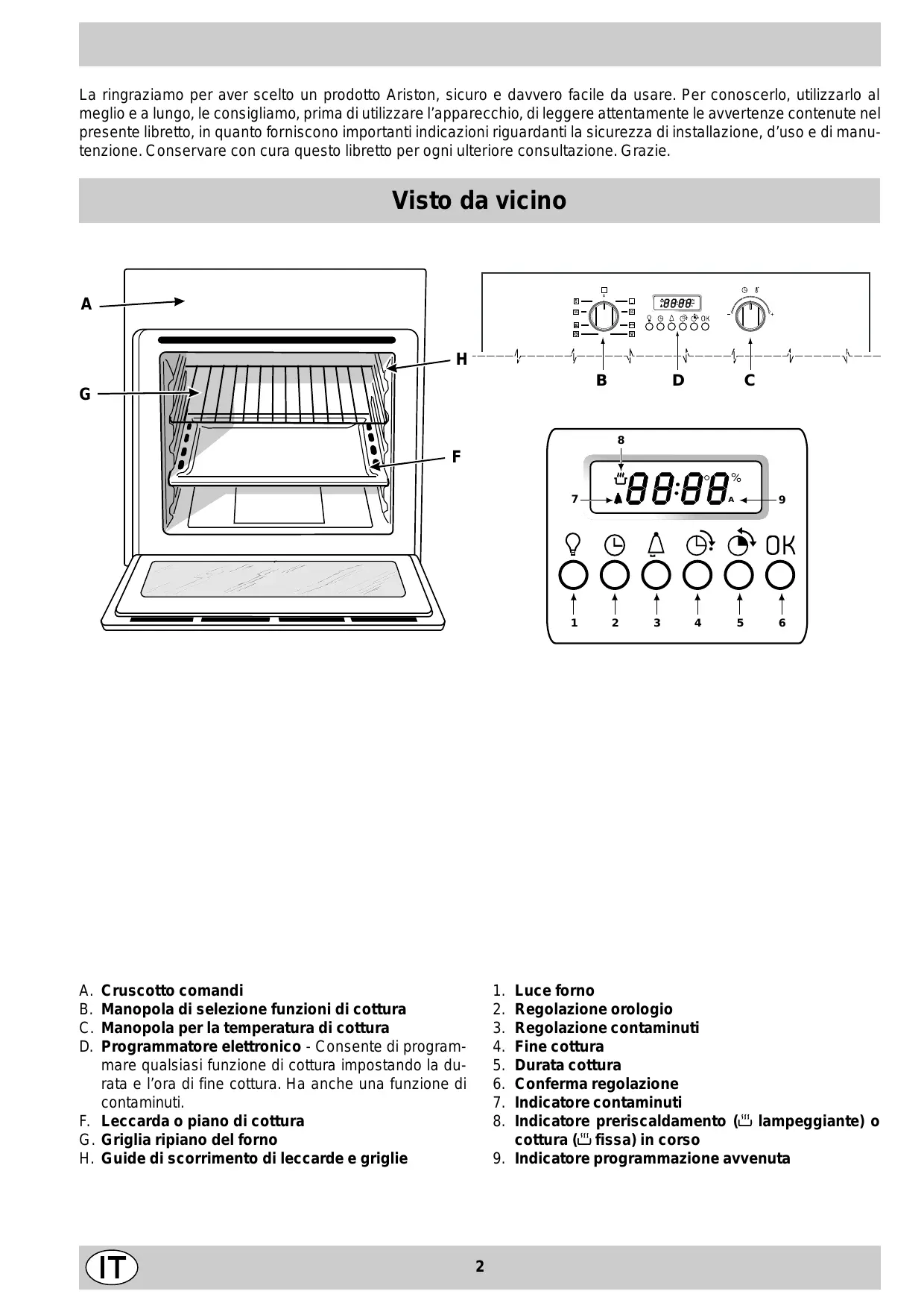 Cruscotto comandi Manopola di selezione funzioni di cottura Manopola per la temperatura di cottura Programmatore elettronico - Consente di programmare qualsiasi funzione di cottura impostando la durata e l’ora di fine cottura. Ha anche una funzione di contaminuti. F. Leccarda o piano di cottura G. Griglia ripiano del forno H. Guide di scorrimento di leccarde e griglie