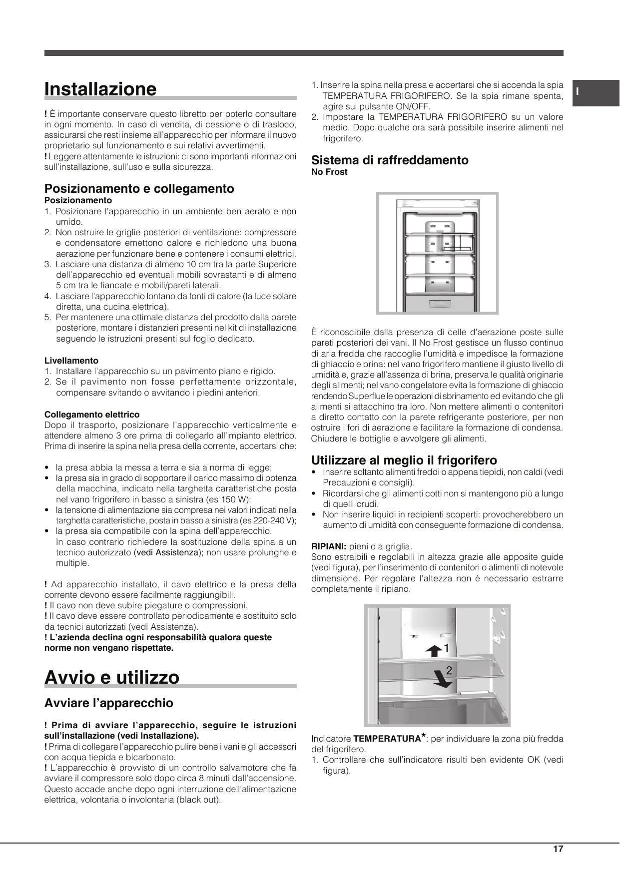 - Non inserire liquidi in recipienti scoperti: provocherebbero un aumento di umidità con conseguente formazione di condensa. RIPIANI: pieni o a griglia. Sono estraibili e regolabili in altezza grazie alle apposite guide (vedi figura), per l’inserimento di contenitori o alimenti di notevole dimensione. Per regolare l’altezza non è necessario estrarre completamente il ripiano. Avvio e utilizzo Avviare l’apparecchio ! Prima di avviare l’apparecchio, seguire le istruzioni sull’installazione (vedi Installazione). ! Prima di collegare l’apparecchio pulire bene i vani e gli accessori con acqua tiepida e bicarbonato. ! L’apparecchio è provvisto di un controllo salvamotore che fa avviare il compressore solo dopo circa 8 minuti dall’accensione. Questo accade anche dopo ogni interruzione dell’alimentazione elettrica, volontaria o involontaria (black out). Indicatore TEMPERATURA*: per individuare la zona più fredda del frigorifero.
