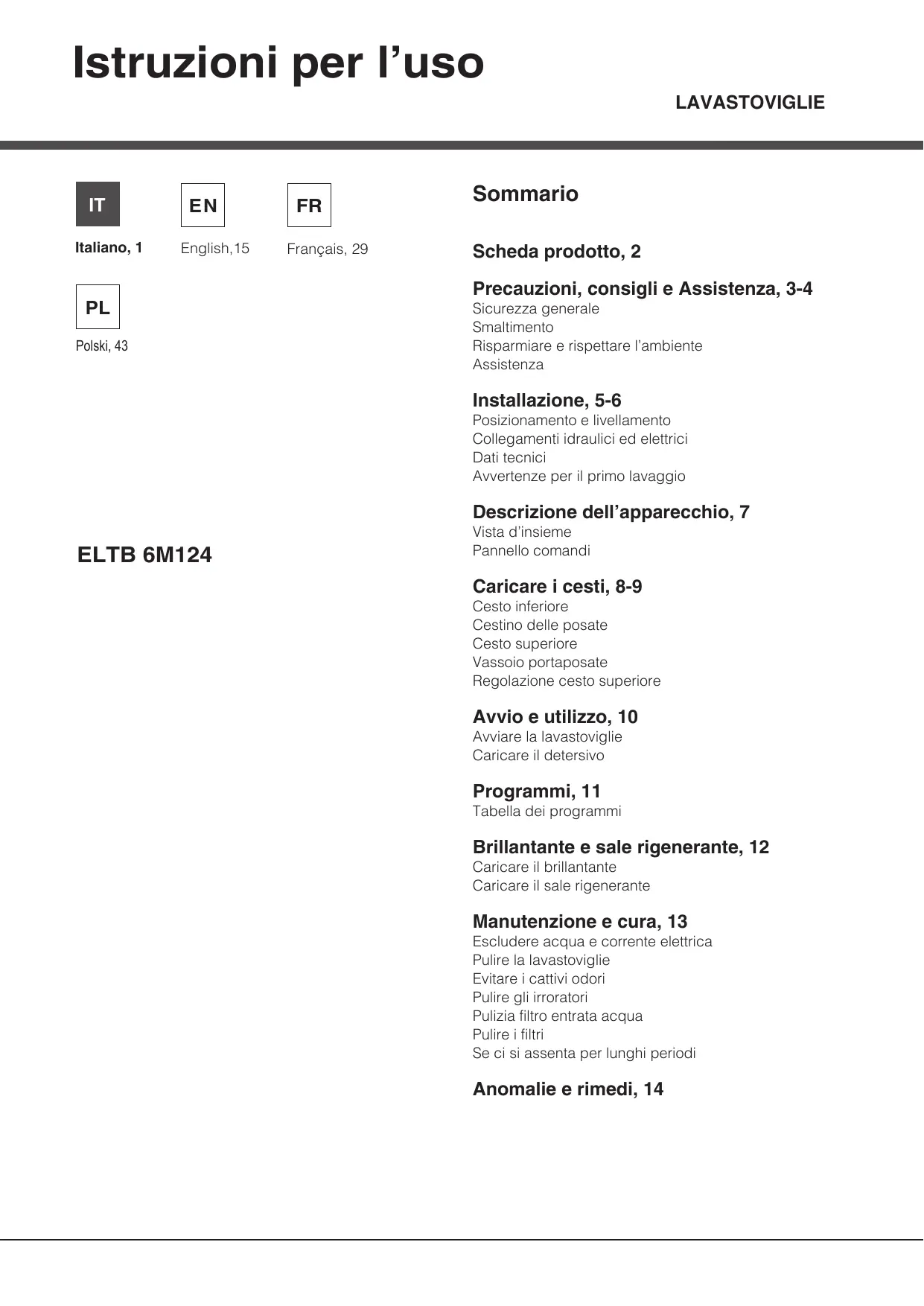 Français, 29 Sommario Scheda prodotto, 2 Precauzioni, consigli e Assistenza, 3-4 Sicurezza generale Smaltimento Risparmiare e rispettare l’ambiente Assistenza Installazione, 5-6 Posizionamento e livellamento Collegamenti idraulici ed elettrici Dati tecnici Avvertenze per il primo lavaggio Descrizione dell’apparecchio, 7 ELTB 6M124 Vista d’insieme Pannello comandi Caricare i cesti, 8-9 Cesto inferiore Cestino delle posate Cesto superiore Vassoio portaposate Regolazione cesto superiore Avvio e utilizzo, 10 Avviare la lavastoviglie Caricare il detersivo Programmi, 11 Tabella dei programmi Brillantante e sale rigenerante, 12 Caricare il brillantante Caricare il sale rigenerante Manutenzione e cura, 13 Escludere acqua e corrente elettrica Pulire la lavastoviglie Evitare i cattivi odori Pulire gli irroratori Pulizia filtro entrata acqua Pulire i filtri Se ci si assenta per lunghi periodi Anomalie e rimedi, 14 Scheda prodotto