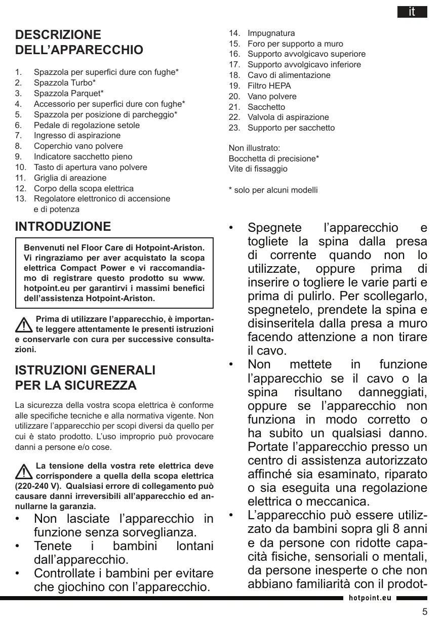 Benvenuti nel Floor Care di Hotpoint-Ariston. Vi ringraziamo per aver acquistato la scopa elettrica Compact Power e vi raccomandiamo di registrar quello prodotto su www. hotspot.eu per garantirvi i massimi benefici dell'assistenza Hotpoint-Ariston.