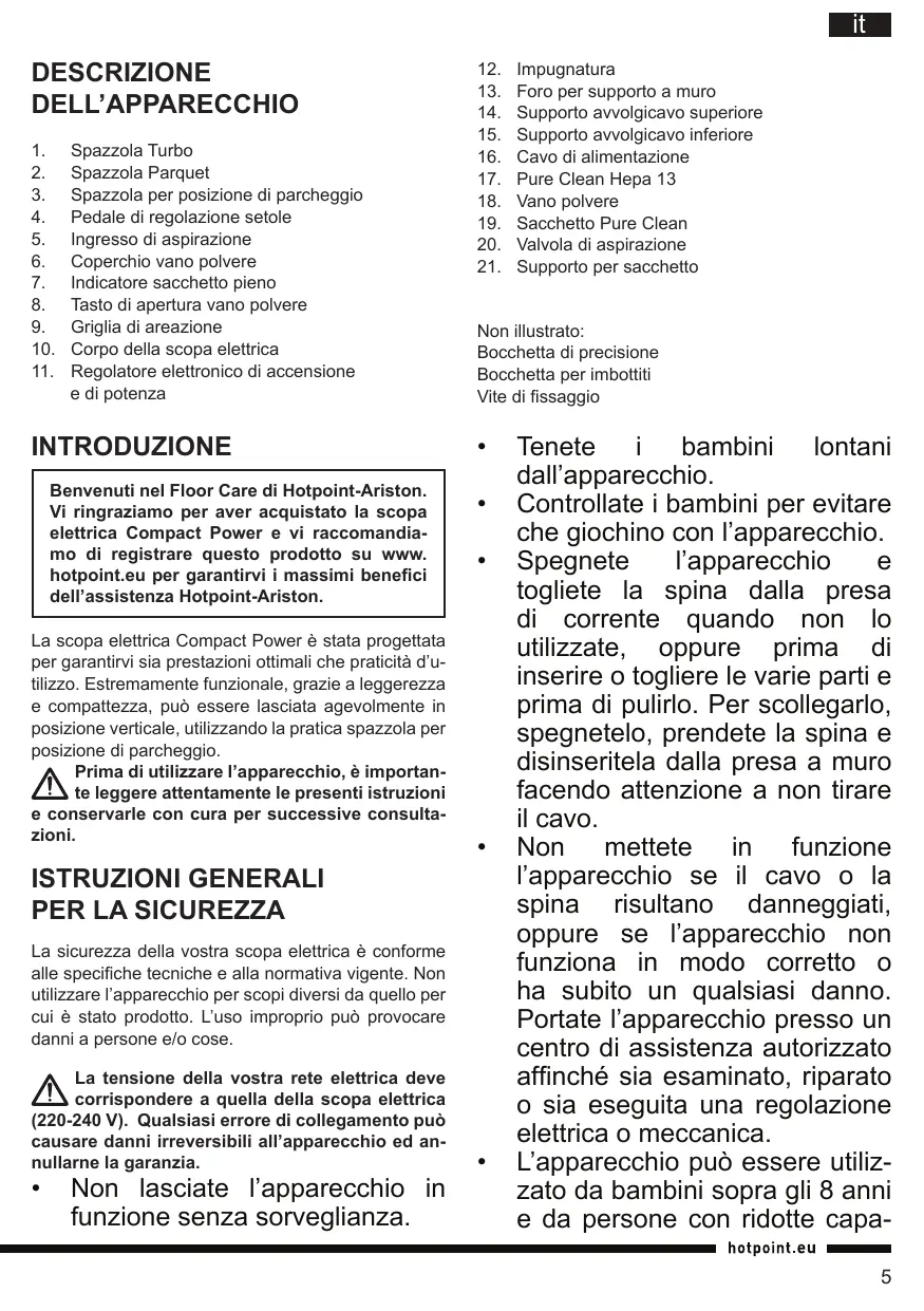 Spazzola Turbo Spazzola Parquet Spazzola per posizione di parcheggio Pedale di regolazione setole Ingresso di aspirazione Coperchio vano polvere Indicatore sacchetto pieno Tasto di apertura vano polvere Griglia di areazione Corpo della scopa elettrica Regolatore elettronico di accensione e di potenza INTRODUZIONE Benvenuti nel Floor Care di Hotpoint-Ariston. Vi ringraziamo per aver acquistato la scopa elettrica Compact Power e vi raccomandiamo di registrare questo prodotto su www. hotpoint.eu per garantirvi i massimi benefici dell’assistenza Hotpoint-Ariston. La scopa elettrica Compact Power è stata progettata per garantirvi sia prestazioni ottimali che praticità d’utilizzo. Estremamente funzionale, grazie a leggerezza e compattezza, può essere lasciata agevolmente in posizione verticale, utilizzando la pratica spazzola per posizione di parcheggio. Prima di utilizzare l’apparecchio, è importante leggere attentamente le presenti istruzioni e conservarle con cura per successive consultazioni. ISTRUZIONI GENERALI