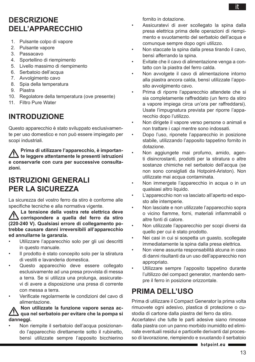 - Nei casi in cui la spina, il cavo di alimentazione o l'apparecchio stesso risultino danneggiati, o in presenza di danni visibili o perdite di acqua dall'apparecchio, non mettete in funzione il ferro da stiro. In tali casi dovrà essere controllato dal personale autorizzato Hotpoint-Ariston, al fine di evitare situazioni pericolose.