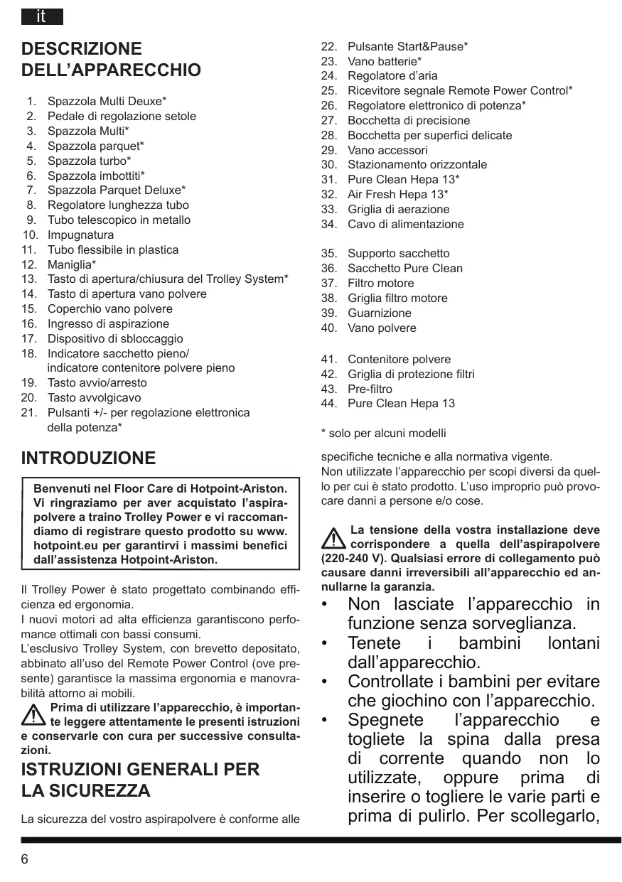della potenza* INTRODUZIONE Benvenuti nel Floor Care di Hotpoint-Ariston. Vi ringraziamo per aver acquistato l’aspirapolvere a traino Trolley Power e vi raccomandiamo di registrare questo prodotto su www. hotpoint.eu per garantirvi i massimi benefici dall’assistenza Hotpoint-Ariston. Il Trolley Power è stato progettato combinando efficienza ed ergonomia. I nuovi motori ad alta efficienza garantiscono perfomance ottimali con bassi consumi. L’esclusivo Trolley System, con brevetto depositato, abbinato all’uso del Remote Power Control (ove presente) garantisce la massima ergonomia e manovrabilità attorno ai mobili. Prima di utilizzare l’apparecchio, è importante leggere attentamente le presenti istruzioni e conservarle con cura per successive consultazioni.
