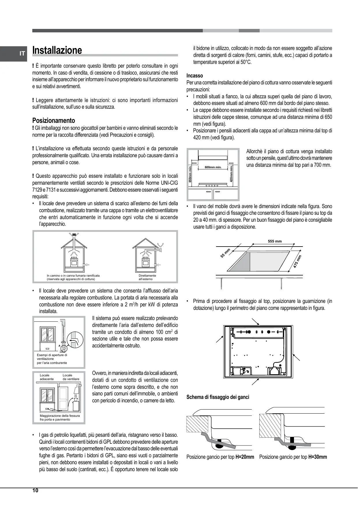 - Gli apparecchi gas necessitano, per un corretto funzionamento, di un regolare ricambio d’aria. Accertarsi che nella loro installazione siano rispettati i requisiti richiesti nel paragrafo relativo al “Posizionamento”.