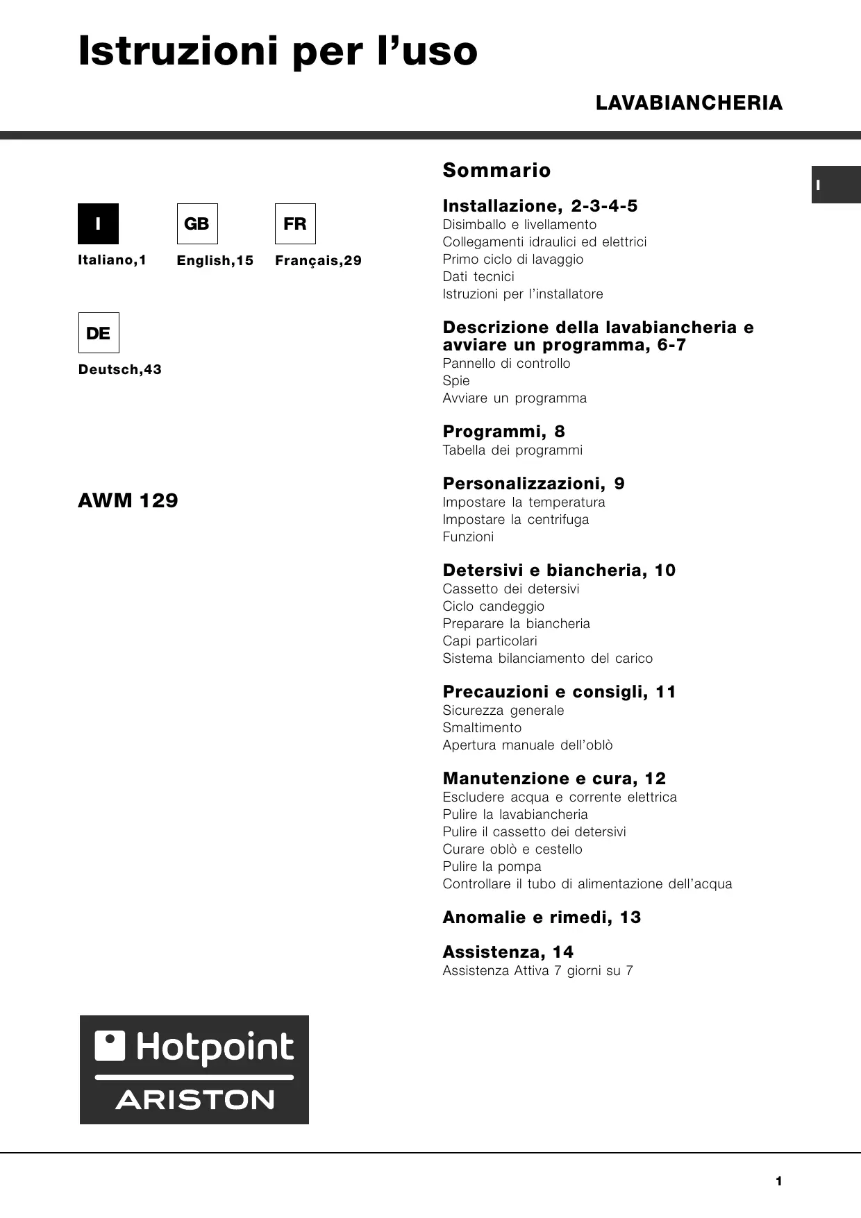 Scarica le istruzioni per il tuo Lavatrice in formato PDF gratuitamente! Trova il tuo manuale AWM 129 - HOTPOINT e riprendi in mano il tuo dispositivo elettronico. In questa pagina sono pubblicati tutti i documenti necessari per l'utilizzo del tuo dispositivo. AWM 129 del marchio HOTPOINT.