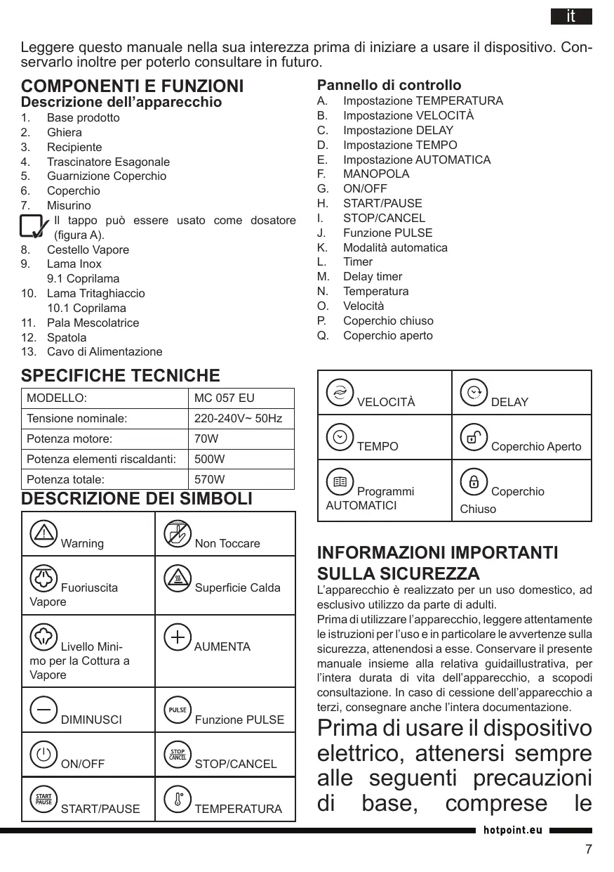 Trova gratuitamente il manuale del dispositivo MC 057C AX0 HOTPOINT in formato PDF.