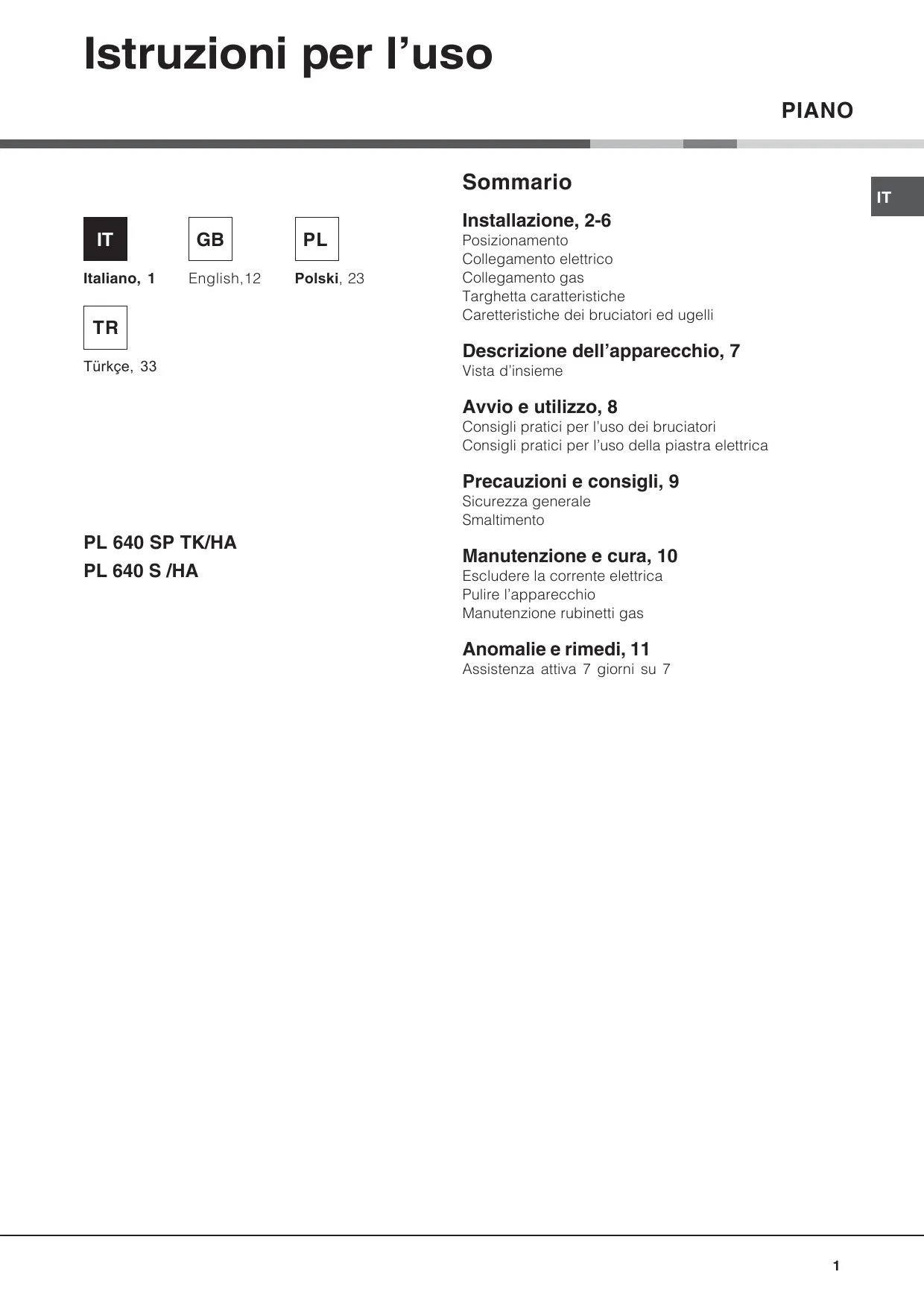 Istruzioni per l’uso PIANO Sommario Installazione, 2-6 GB PL Posizionamento Collegamento elettrico Italiano, 1 English,12 Polski, 23 Collegamento gas Targhetta caratteristiche Caretteristiche dei bruciatori ed ugelli : Descrizione dell’apparecchio, 7 Türkçe, 33 Vista d'insieme Avvio e utilizzo, 8 Consigli pratici per l'uso dei bruciatori Consigli pratici per l'uso della piastra elettrica Precauzioni e consigli, 9 Sicurezza generale Smaltimento PL 640 SP TK/HA Manutenzione e cura, 10 PL 640 S /HA Escludere la corrente elettrica Pulire l'apparecchio Manutenzione rubinetti gas Anomalie e rimedi, 11 Assistenza attiva 7 giorni su 7