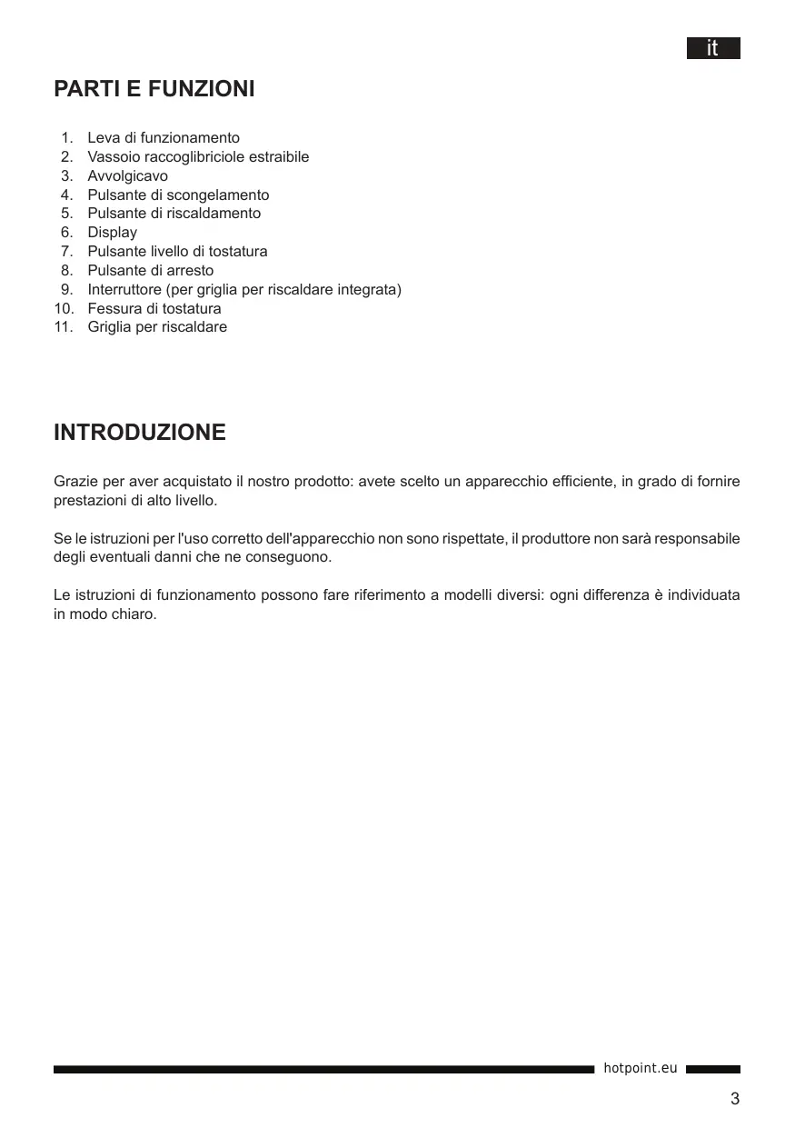 Leva di funzionamento Vassoio raccoglibriciole estraibile Avvolgicavo Pulsante di scongelamento Pulsante di riscaldamento Display Pulsante livello di tostatura Pulsante di arresto Interruttore (per griglia per riscaldare integrata) Fessura di tostatura Griglia per riscaldare INTRODUZIONE Grazie per aver acquistato il nostro prodotto: avete scelto un apparecchio efficiente, in grado di fornire prestazioni di alto livello. Se le istruzioni per l'uso corretto dell'apparecchio non sono rispettate, il produttore non sarà responsabile degli eventuali danni che ne conseguono. Le istruzioni di funzionamento possono fare riferimento a modelli diversi: ogni differenza è individuata in modo chiaro. hotpoint.eu