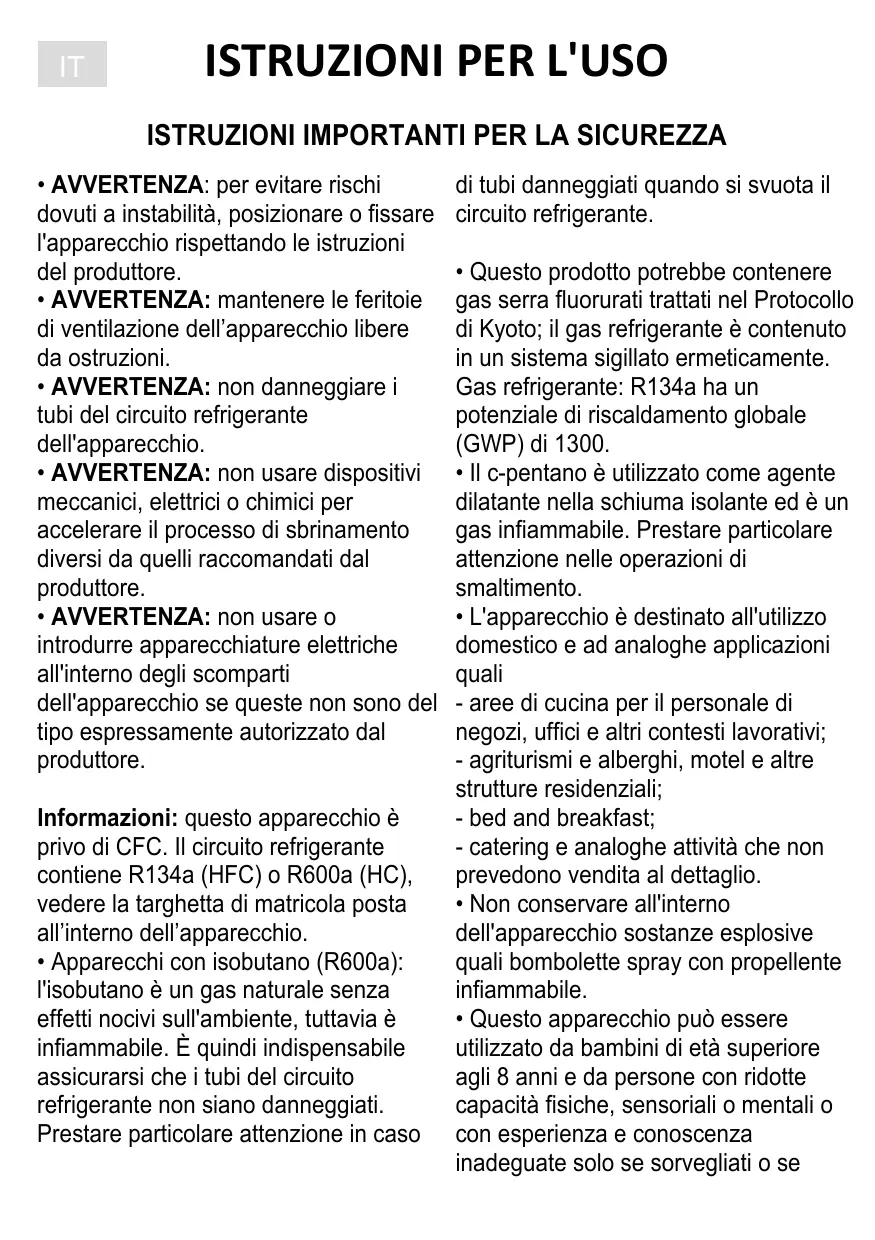 + AVVERTENZA: per evitare rischi dovuti a instabilità, posizionare o fissare l'apparecchio rispettando le istruzioni del produttore. + AVVERTENZA: mantenere le feritoie di ventilazione dell'apparecchio libere da ostruzioni. + AVVERTENZA: non danneggiare i tubi del circuito refrigerante dell'apparecchio. + AVVERTENZA: non usare dispositivi meccanici, elettrici o chimici per accelerare il processo di sbrinamento diversi da quelli raccomandati dal produttore. + AVVERTENZA: non usare o introdurre apparecchiature elettriche all'interno degli scomparti dell'apparecchio se queste non sono del tipo espressamente autorizzato dal produttore. Informazioni: questo apparecchio à privo di CFC. Il circuito refrigerante contiene R134a (HFC) o R600a (HC), vedere la targhetta di matricola posta all'interno dell'apparecchio. + Apparecchi con isobutano (R600a): l'isobutano à un gas naturale senza effetti nocivi sull'ambiente, tuttavia à infiammabile. Ë quindi indispensabile assicurarsi che i tubi del circuito refrigerante non siano danneggjiati. Prestare particolare attenzione in caso di tubi danneggjiati quando si svuota il circuito refrigerante. + Questo prodotto potrebbe contenere gas serra fluorurati trattati nel Protocollo di Kyoto; il gas refrigerante à contenuto in un sistema sigillato ermeticamente. Gas refrigerante: R134a ha un potenziale di riscaldamento globale (GWP) di 1300. + Il c-pentano è utilizzato come agente dilatante nella schiuma isolante ed à un gas infiammabile. Prestare particolare attenzione nelle operazioni di smaltimento. + L'apparecchio à destinato all'utilizzo domestico e ad analoghe applicazioni quali - aree di cucina per il personale di negozi, uffici e altri contesti lavorativi; - agriturismi e alberghi, motel e altre strutture residenziali; - bed and breakfast; - catering e analoghe attività che non prevedono vendita al dettaglio. + Non conservare all'interno dell'apparecchio sostanze esplosive quali bombolette spray con propellente infiammabile. + Questo apparecchio pud essere utilizzato da bambini di età superiore agli 8 anni e da persone con ridotte capacità fisiche, sensoriali o mentali o con esperienza e conoscenza inadeguate solo se sorvegliati o se