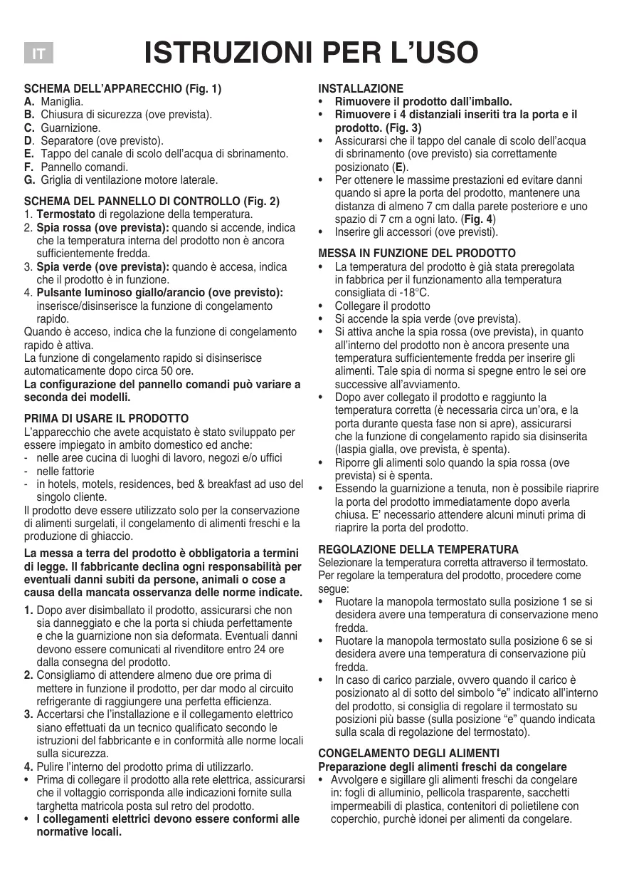 Il prodotto deve essere utilizzato solo per la conservazione di alimenti surgelati, il congelamento di alimenti freschi e la produzione di ghiaccio.