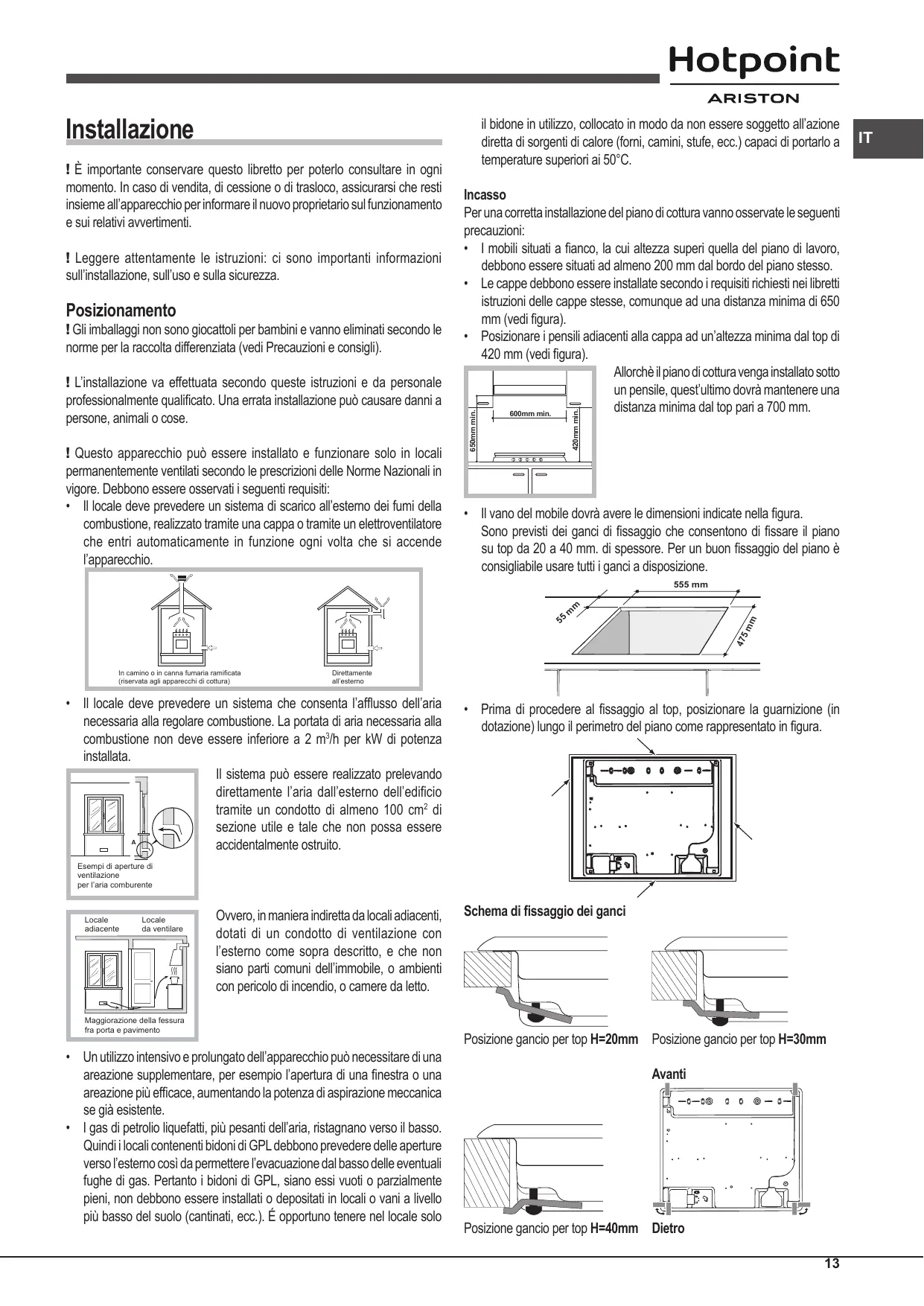 - Il locale deve prevedere un sistema di scarico all’esterno dei fumi della combustione, realizzato tramite una cappa o tramite un elettroventilatore che entri automaticamente in funzione ogni volta che si accende l’apparecchio. 420mm min. ! Leggere attentamente le istruzioni: ci sono importanti informazioni sull’installazione, sull’uso e sulla sicurezza. Incasso Per una corretta installazione del piano di cottura vanno osservate le seguenti precauzioni: