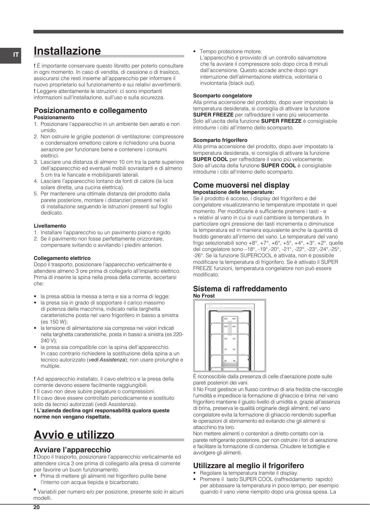 - Tempo protezione motore. L’apparecchio è provvisto di un controllo salvamotore che fa avviare il compressore solo dopo circa 8 minuti dall’accensione. Questo accade anche dopo ogni interruzione dell’alimentazione elettrica, volontaria o involontaria (black out). Scomparto congelatore Alla prima accensione del prodotto, dopo aver impostato la temperatura desiderata, si consiglia di attivare la funzione SUPER FREEZE per raffreddare il vano più velocemente. Solo all’uscita della funzione SUPER FREEZE è consigliabile introdurre i cibi all’interno dello scomparto. Scomparto frigorifero Alla prima accensione del prodotto, dopo aver impostato la temperatura desiderata, si consiglia di attivare la funzione SUPER COOL per raffreddare il vano più velocemente. Solo all’uscita della funzione SUPER COOL è consigliabile introdurre i cibi all’interno dello scomparto. Come muoversi nel display Impostazione delle temperature: Se il prodotto è acceso, i display del frigorifero e del congelatore visualizzeranno le temperature impostate in quel momento. Per modificarle è sufficiente premere i tasti - e + relativi al vano in cui si vuol cambiare la temperatura. In particolare ogni pressione dei tasti incrementa o diminuisce la temperatura ed in maniera equivalente anche la quantità di freddo generato all’interno del vano. Le temperature del vano frigo selezionabili sono +8°, +7°, +6°, +5°, +4°, +3°, +2°, quelle del congelatore sono –18°, -19°,-20°, -21°, -22°, -23°,-24°,-25°, -26°. Se la funzione SUPERCOOL è attivata, non è possibile modificare la temperatura di frigorifero. Se è attivato il SUPER FREEZE funzioni, temperatura congelatore non può essere modificato. Sistema di raffreddamento No Frost È riconoscibile dalla presenza di celle d’aerazione poste sulle pareti posteriori dei vani. Il No Frost gestisce un flusso continuo di aria fredda che raccoglie l’umidità e impedisce la formazione di ghiaccio e brina: nel vano frigorifero mantiene il giusto livello di umidità e, grazie all’assenza di brina, preserva le qualità originarie degli alimenti; nel vano congelatore evita la formazione di ghiaccio rendendo superflue le operazioni di sbrinamento ed evitando che gli alimenti si attacchino tra loro. Non mettere alimenti o contenitori a diretto contatto con la parete refrigerante posteriore, per non ostruire i fori di aerazione e facilitare la formazione di condensa. Chiudere le bottiglie e avvolgere gli alimenti. Utilizzare al meglio il frigorifero