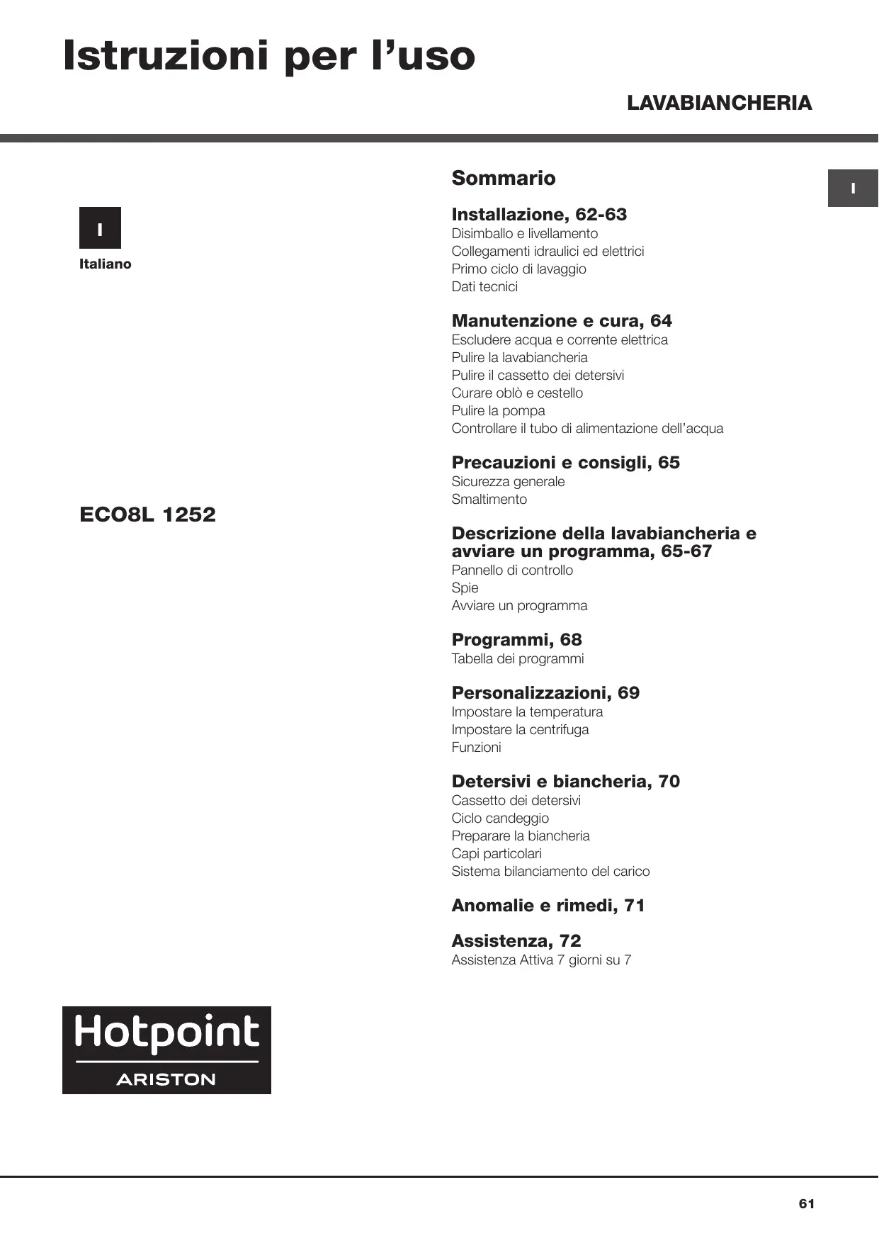 Scarica le istruzioni per il tuo Lavatrice in formato PDF gratuitamente! Trova il tuo manuale ECO8L 1252 EU.M - HOTPOINT e riprendi in mano il tuo dispositivo elettronico. In questa pagina sono pubblicati tutti i documenti necessari per l'utilizzo del tuo dispositivo. ECO8L 1252 EU.M del marchio HOTPOINT.