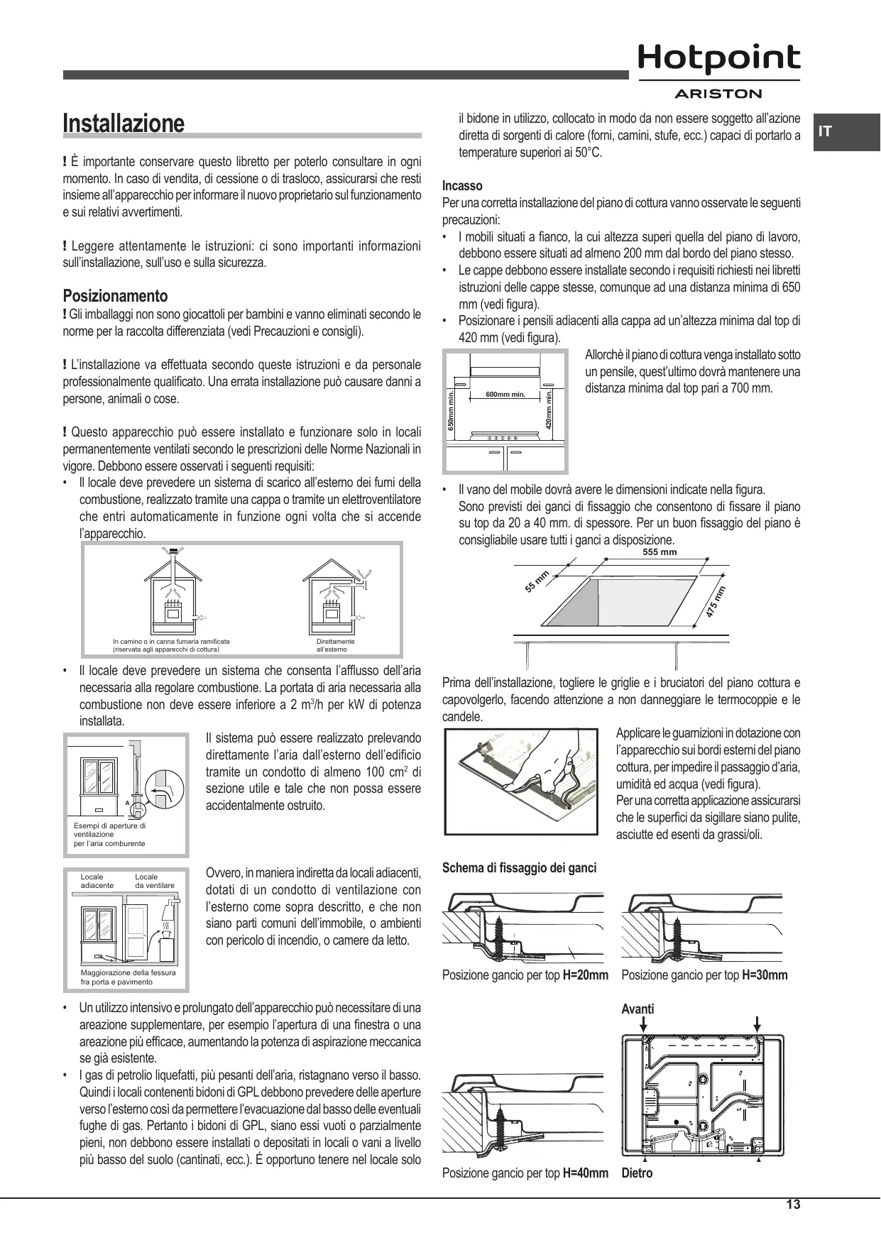 • Il vano del mobile dovrà avere le dimensioni indicate nella figura. Sono previsti dei ganci di fissaggio che consentono di fissare il piano su top da 20 a 40 mm. di spessore. Per un buon fissaggio del piano è consigliabile usare tutti i ganci a disposizione. 555 mm