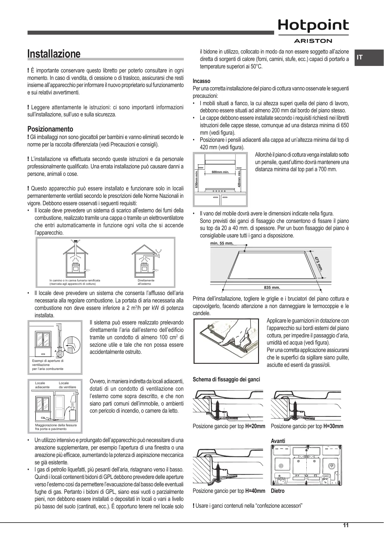 - Il locale deve prevedere un sistema di scarico all’esterno dei fumi della combustione, realizzato tramite una cappa o tramite un elettroventilatore che entri automaticamente in funzione ogni volta che si accende l’apparecchio. 420mm min. ! Leggere attentamente le istruzioni: ci sono importanti informazioni sull’installazione, sull’uso e sulla sicurezza. Incasso Per una corretta installazione del piano di cottura vanno osservate le seguenti precauzioni: