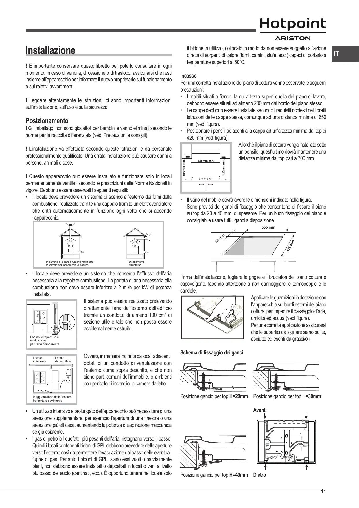 • Il vano del mobile dovrà avere le dimensioni indicate nella figura. Sono previsti dei ganci di fissaggio che consentono di fissare il piano su top da 20 a 40 mm. di spessore. Per un buon fissaggio del piano è consigliabile usare tutti i ganci a disposizione. 555 mm